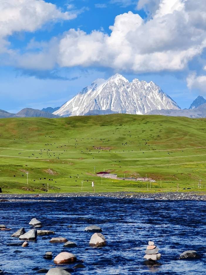 走进纳梯村,仿佛闯进了莫奈花园,大片的青稞田与五彩斑斓的野花肆意铺展,藏式民居错落其间。沿着溪边漫步,溪水潺潺,远处的雪山在阳光照耀下闪耀着圣洁的光芒,牦牛和羊群悠然吃草,构成一幅宁静的田园风光图。