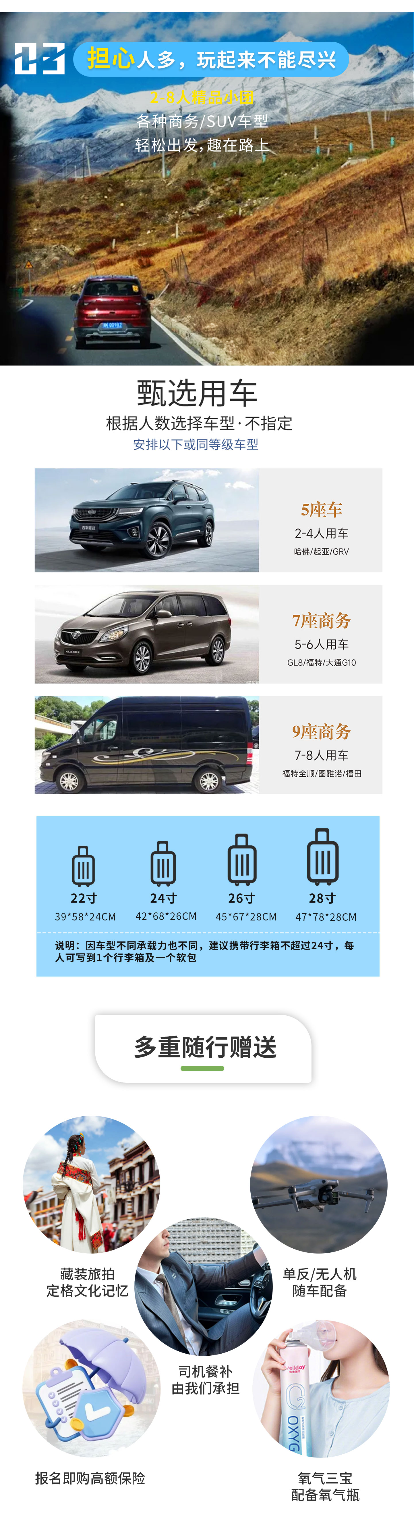1、用车:5座SUV或7座、9座商务车随机安排;