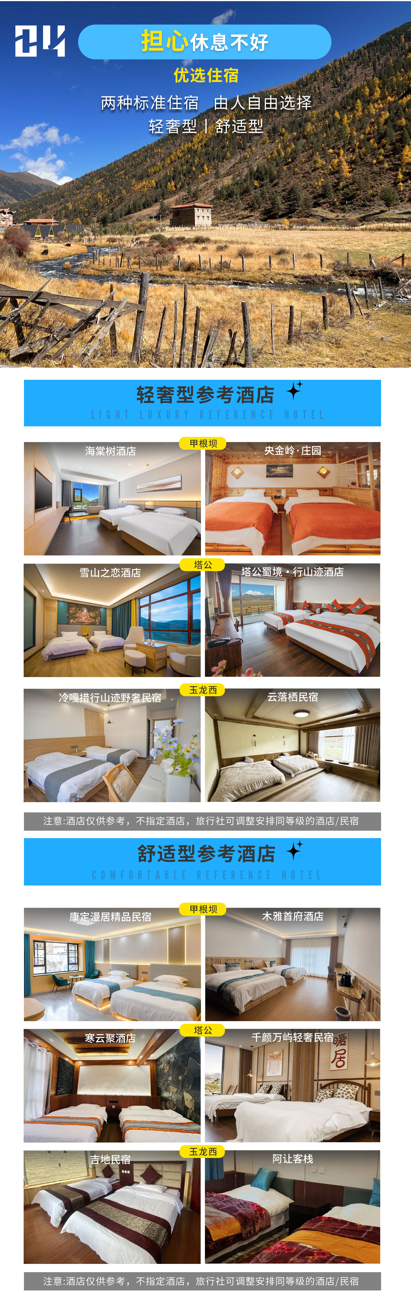 2、住宿: 所列4晚住宿(民宿/酒店),藏区条件有限,住宿标准不可与城市相比较, 建议自带洗漱用品,如对住宿要求高建议选择高标准住宿套餐 ;