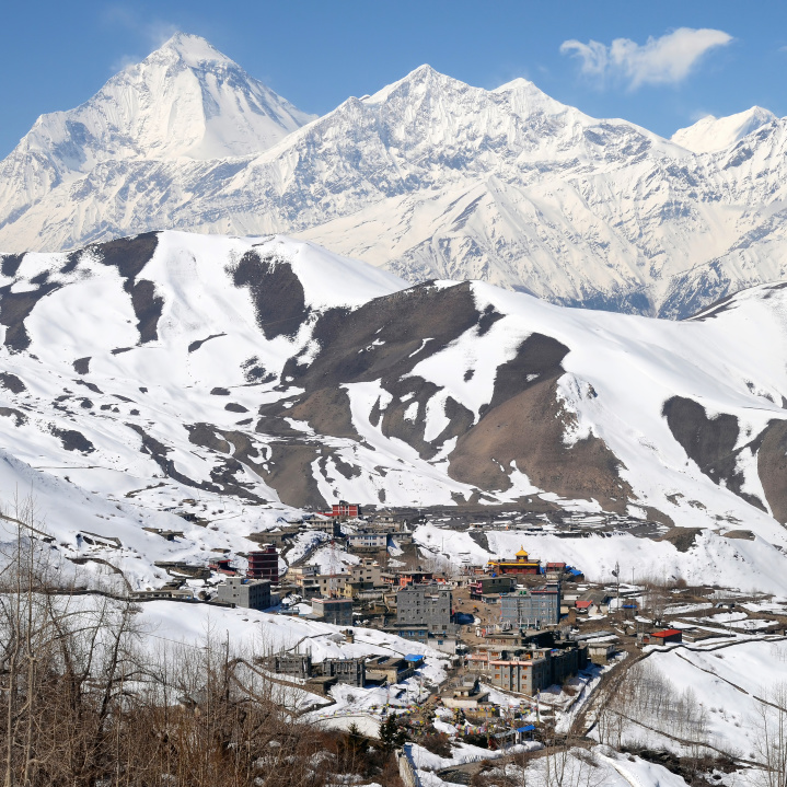 今天我们将前往Jomsom,道路都很好走,今天你还会见到尼泊尔最好的公路。在Muktinath,你还可以看到很多手工牦牛毛围巾的家庭店,喜欢的话可以带上几条,价格都很便宜。这边已经属于木斯塘县,沿途的建筑跟西藏的很像,甚至让你有置身西藏的错觉。今天都是缓缓的下坡,11点半左右就能到达Kagbeni。在此之前,我们就能看到离得很近的道拉吉里峰了。午饭后,继续前行大概两个小时后,到达Jomsom,我们今晚就在此休息了。Jomsom是一个很大的村子,这里有机场,有军队,也是一个很大的集散点