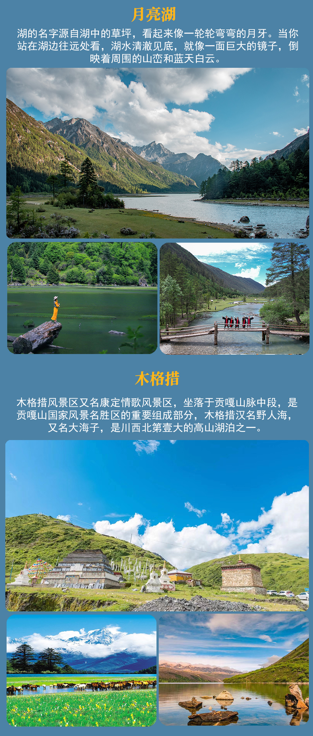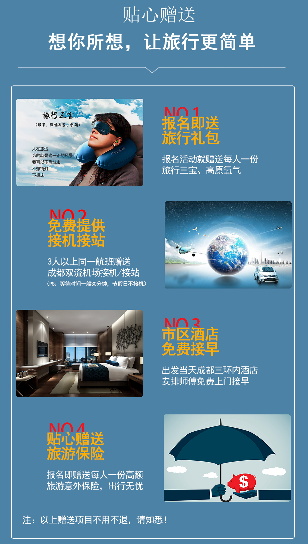 6、超值赠送:木格措景区门票(观光车自理)、藏装旅拍、1特色餐、三环内接早、旅游三宝、氧气。