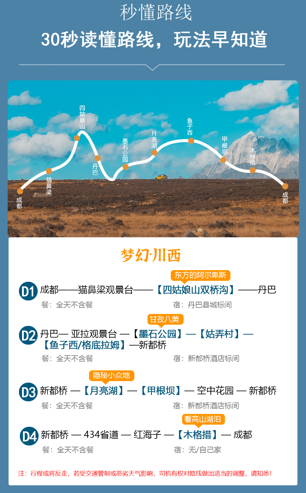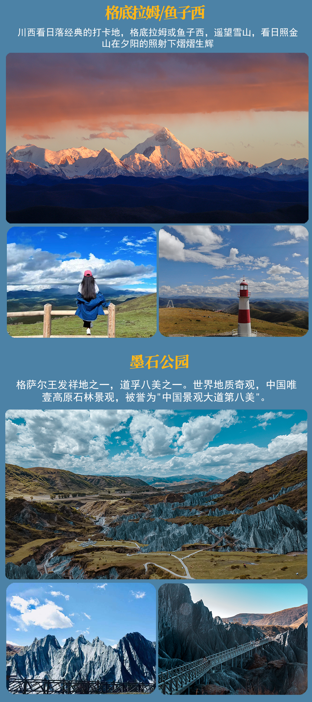 2、如鱼子西无法前往,替换为八郎生都村、扎真、新都桥观景台等同类型观景点,如产生相关景点中转车、清洁费等费用,需自理。