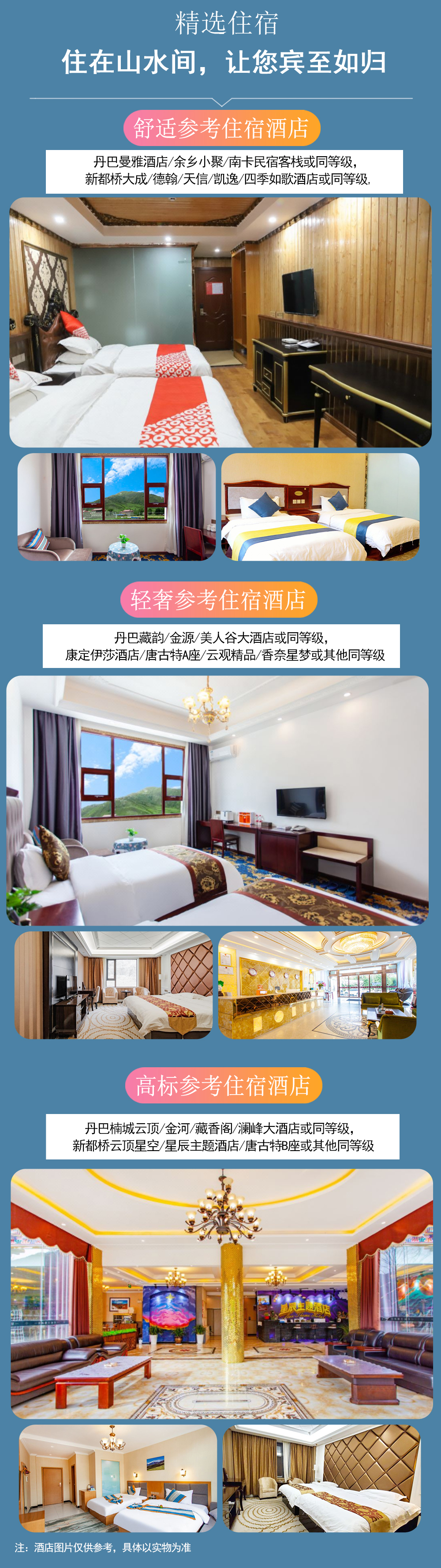 2、用餐:舒适型、轻奢型不提供早餐,豪华住提供酒店早餐,其余正餐敬请自理(酒店用早不用不退换);