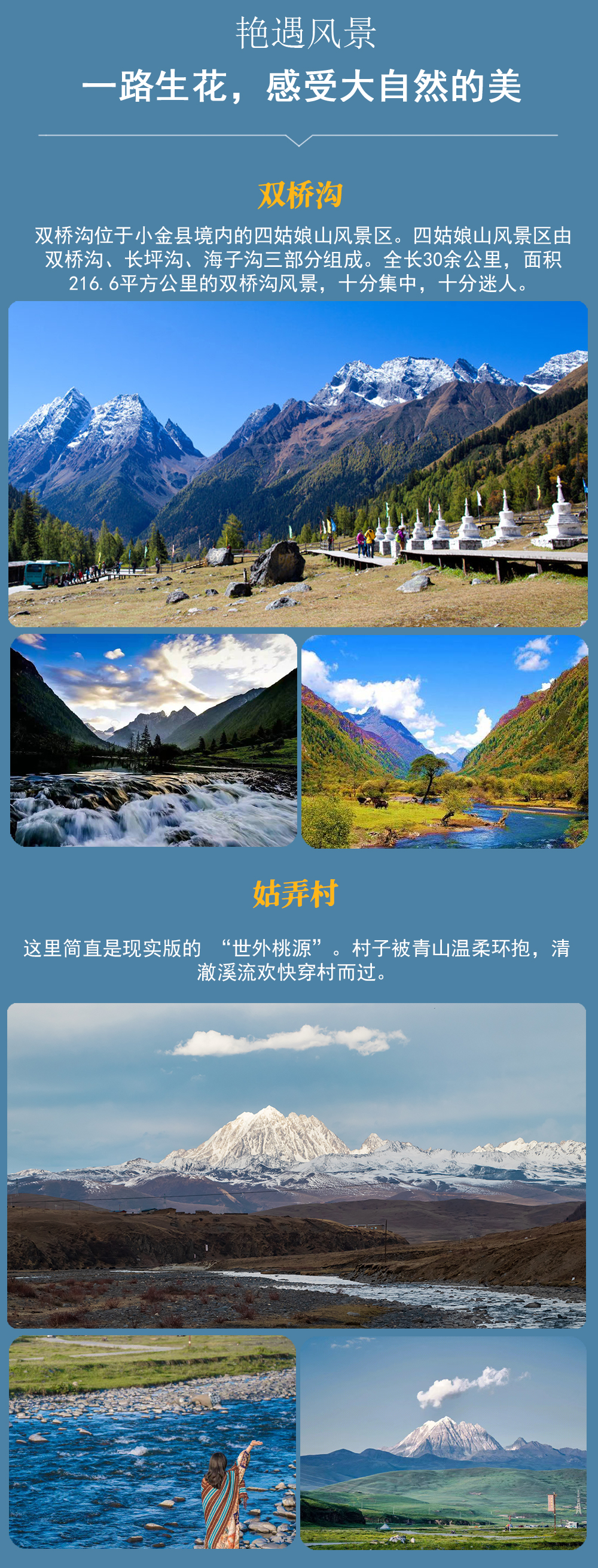 早餐过后7-8点出发(天气原因,出发时间较早,具体时间以领队短信通知为准),成都出发经都汶高速,途经卧龙熊猫谷前往四姑娘山猫鼻梁在猫鼻梁远眺,前面是海子沟,后面是四姑娘山,可观四姑娘山全貌,风景很是震撼;前往四姑娘山镇午餐,随后前往双桥沟景区游玩,【四姑娘山双桥沟,平均海拔约3500米,游玩时间约3小时】沟内主要以雪峰、牧场、草地、森林等为主,沟内山势陡峭曲折,林木葱郁,是四姑娘山美丽的一条沟。漫步沟内,可体验到真正的牧区风光。每当春秋季节,沟内五颜六色,蔚为壮观。沟内有观光车直达沟尾,可以毫不费力,轻松观赏沟内奇景; 游玩过后前往丹巴甲居藏寨或者丹巴县城