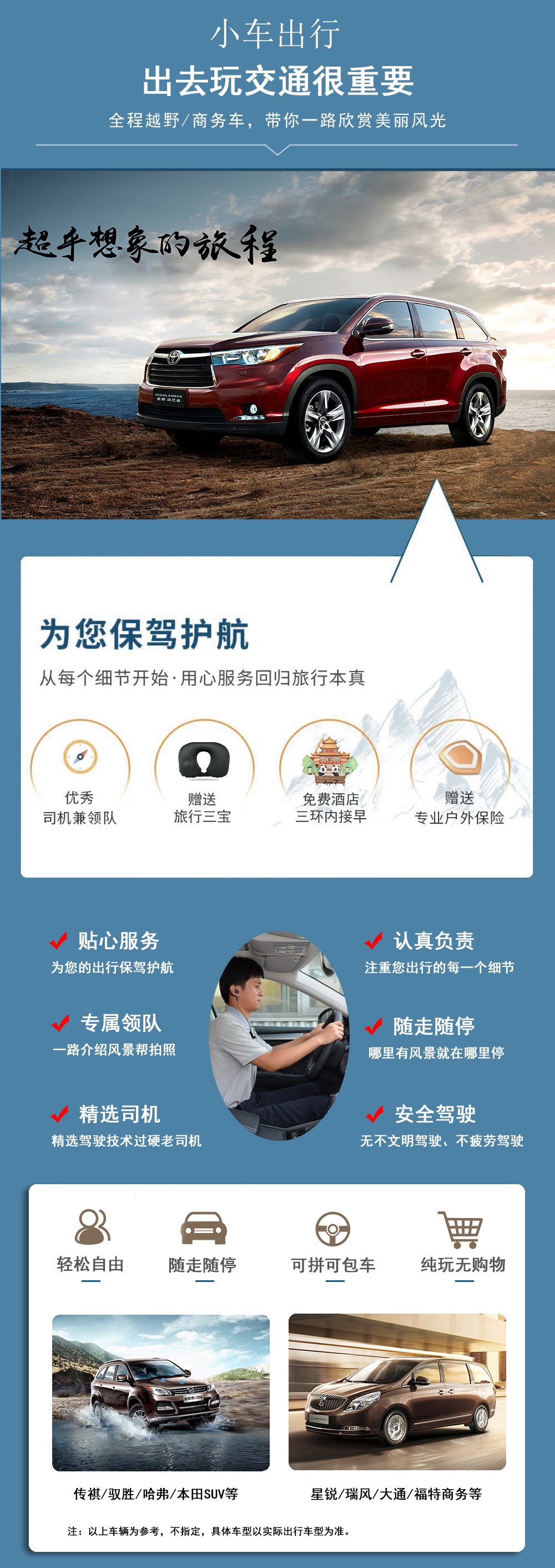 1、交通:2-8人团,根据人数安排车型,全程5座舒适越野车或7-9座商务车(车型参考—5座越野车:牧游侠/驭胜等,7-9座商务车:瑞风/传祺/福特/大通G10等。行李参考—每人不超过24寸行李箱1个)含车辆使用费/油路费/过路费/停车费等、司机服务费(司机住补已含),