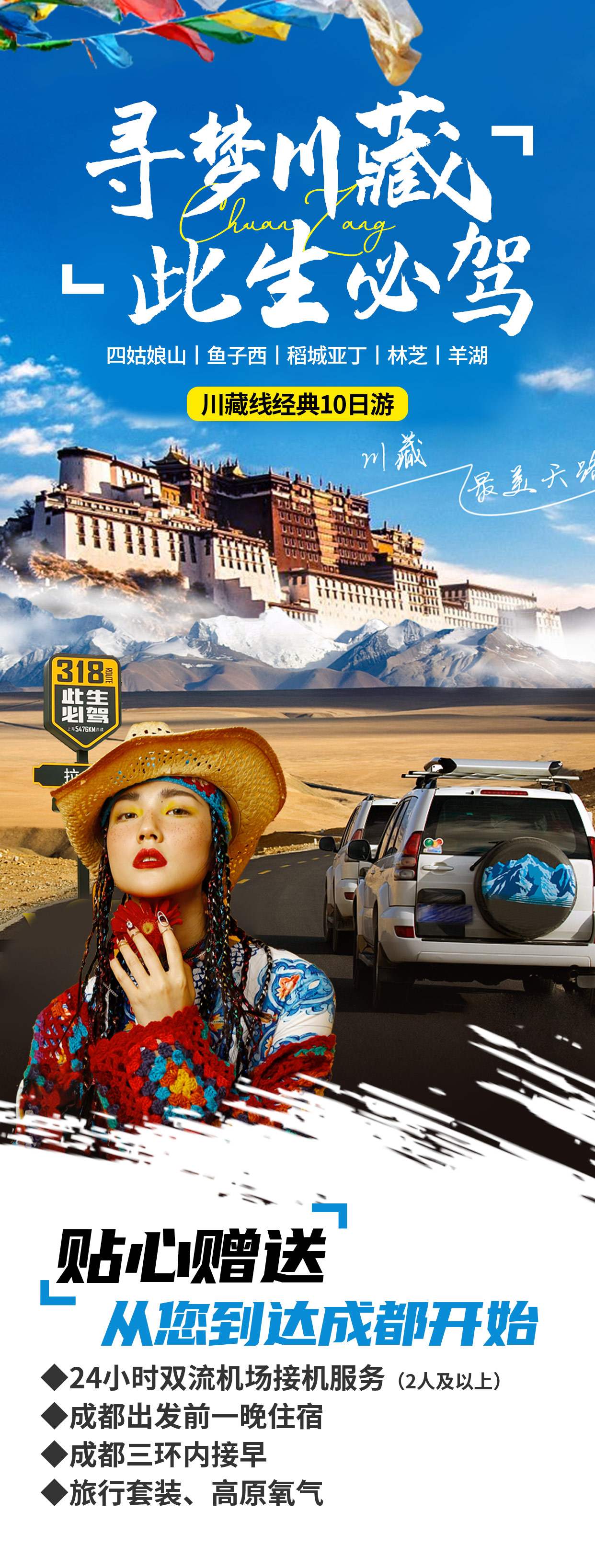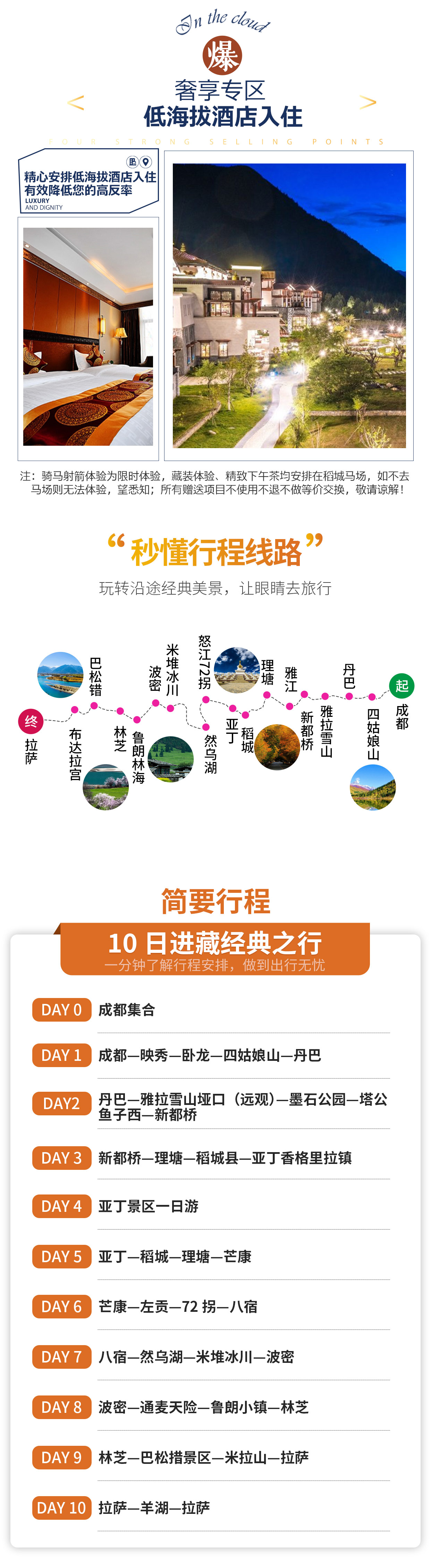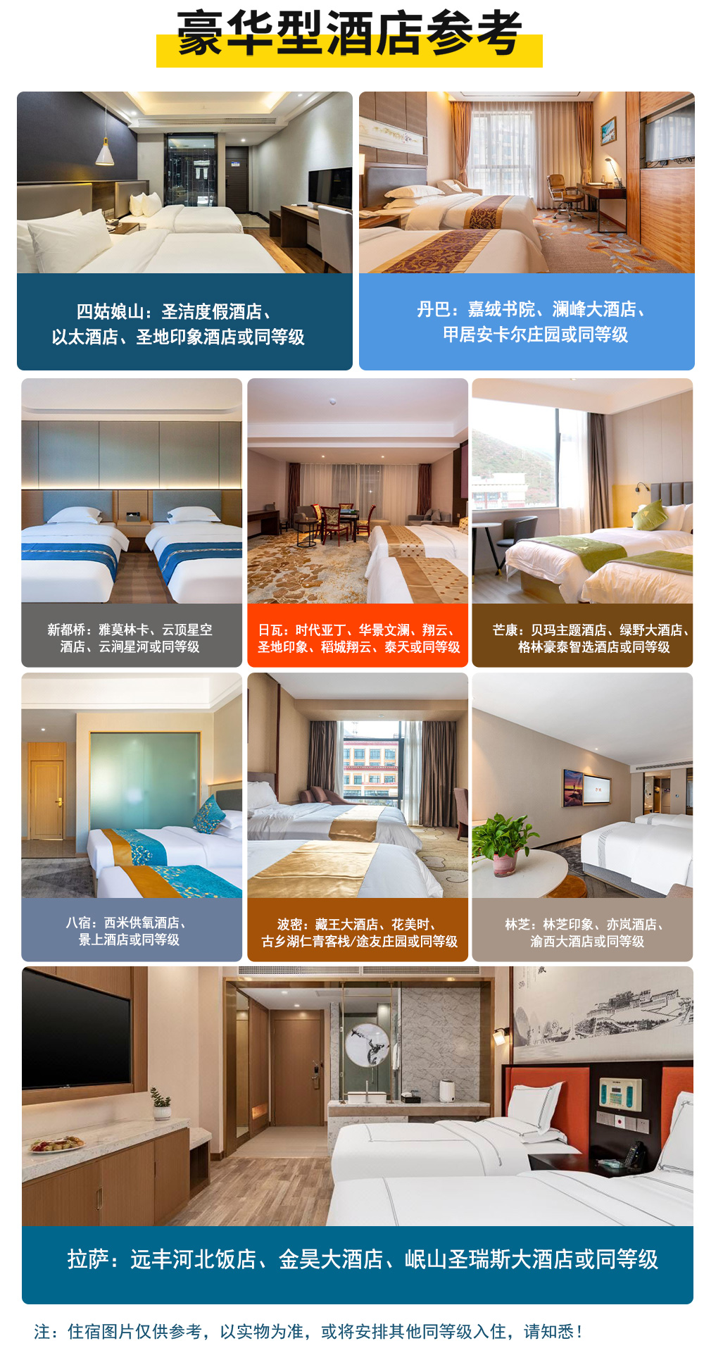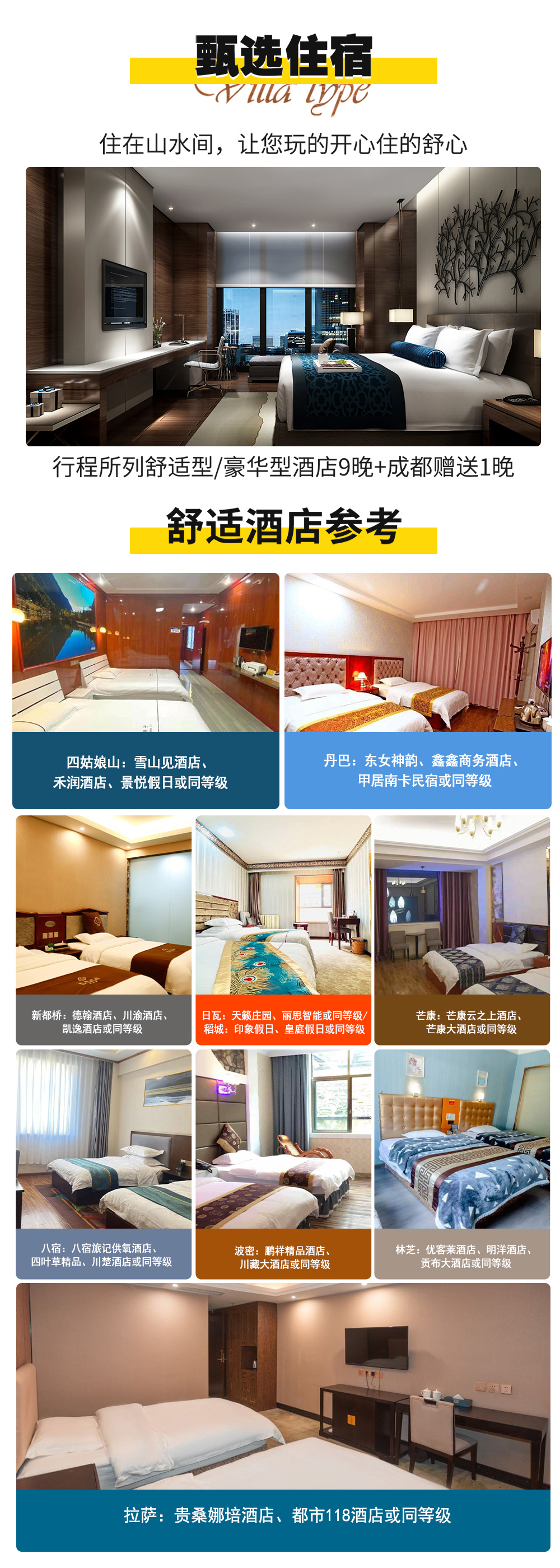 4、住宿:行程所列舒适型/豪华型酒店9晚+成都赠送1晚舒适酒店,(整个行程不提供自然单间,若是出现单男单女请自补房差;不含住宿套餐住宿自理,需要均摊司机住宿);