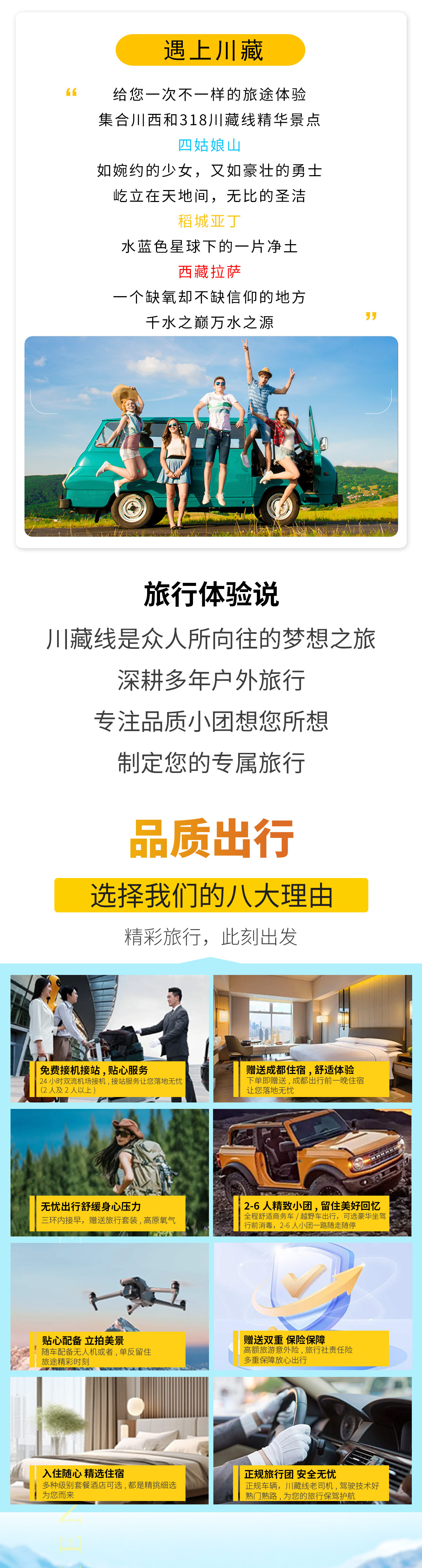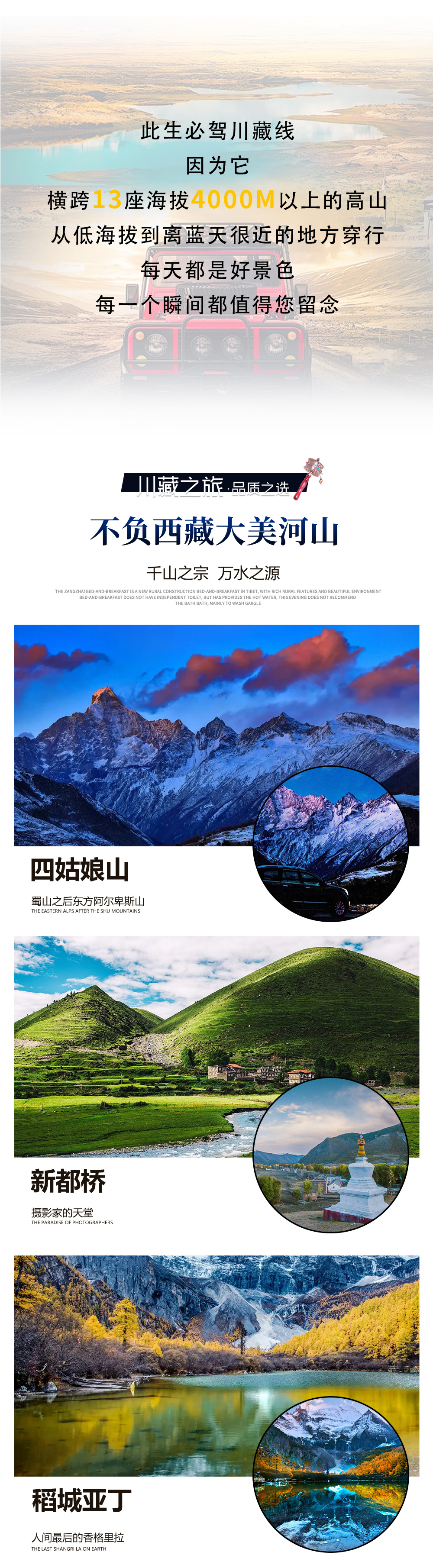 3、门票:不含景点门票及观光车(四姑娘门票80元、观光车70元,甲居藏寨门票50,观光车30元、,亚丁门票+观光车266元、米堆冰川50+观光车36元、雅鲁藏布江大峡谷260元,羊湖门票60元),鱼子西/八朗生都/格底拉姆中转车费(若原车前往仍需要收取该中转费用);