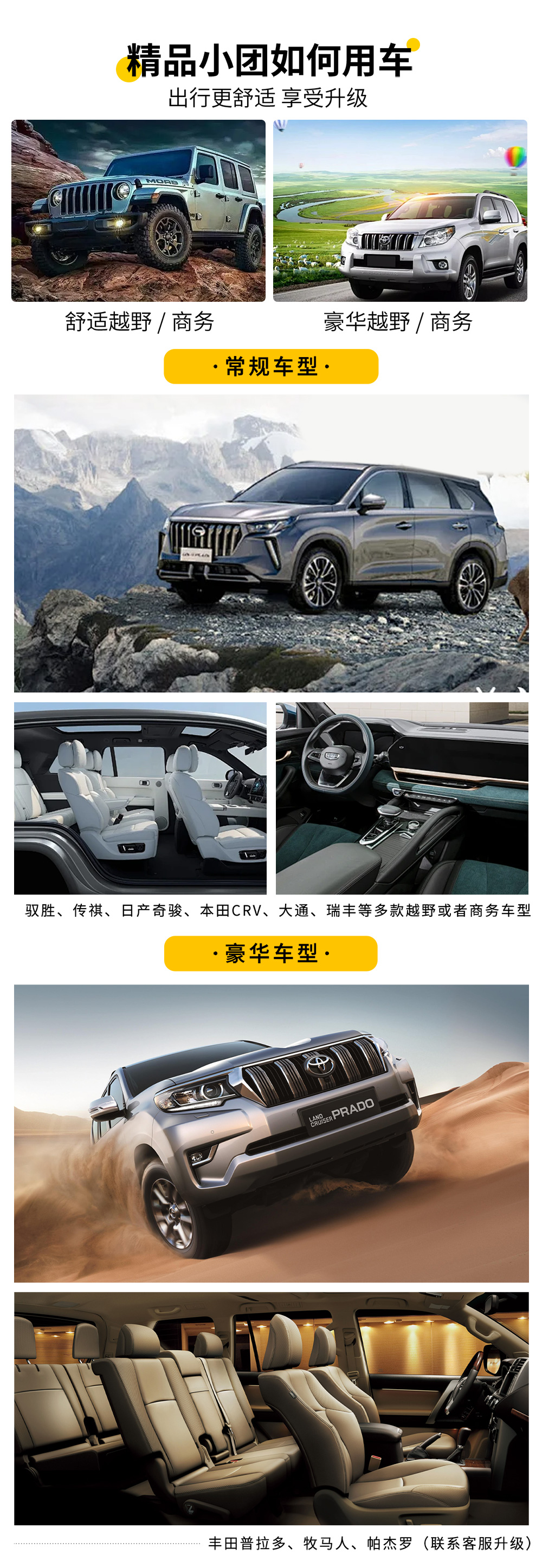 2、升级车型:丰田普拉多、牧马人、帕杰罗(联系客服付费升级);