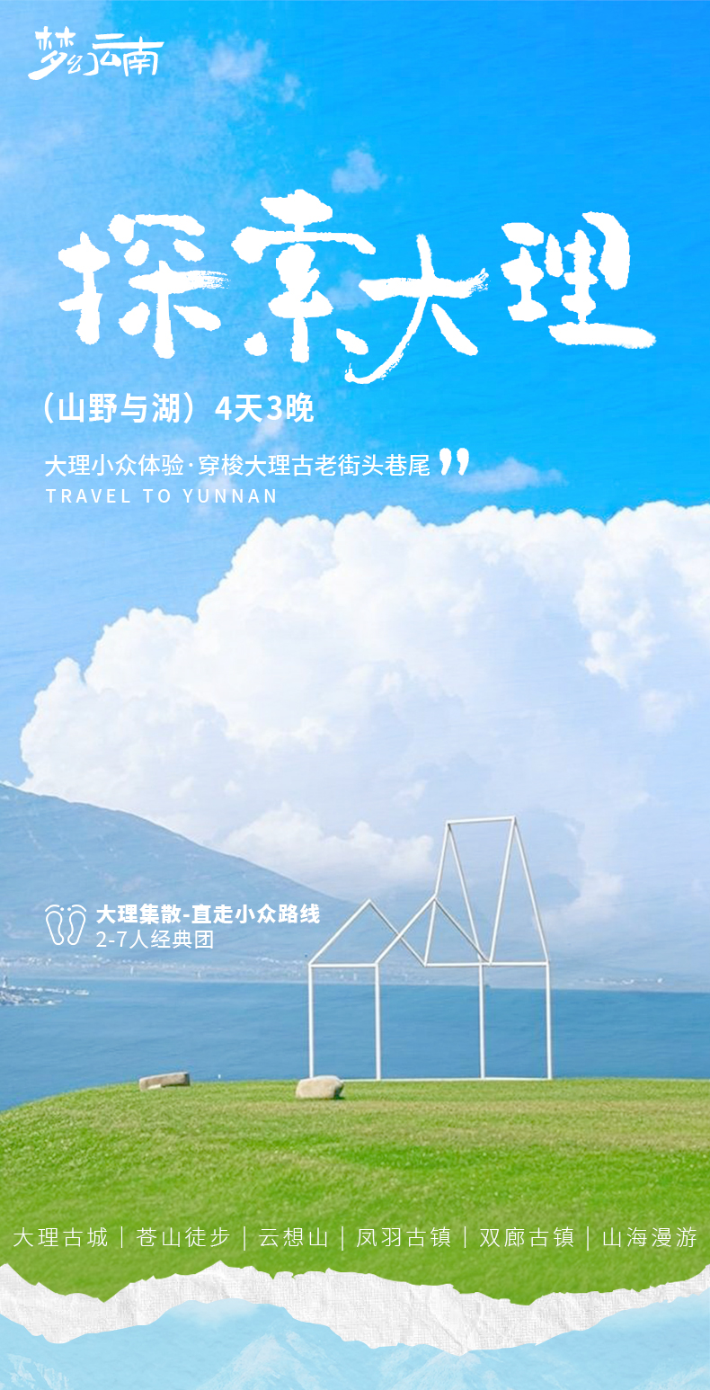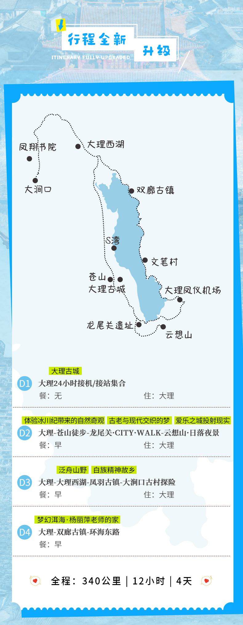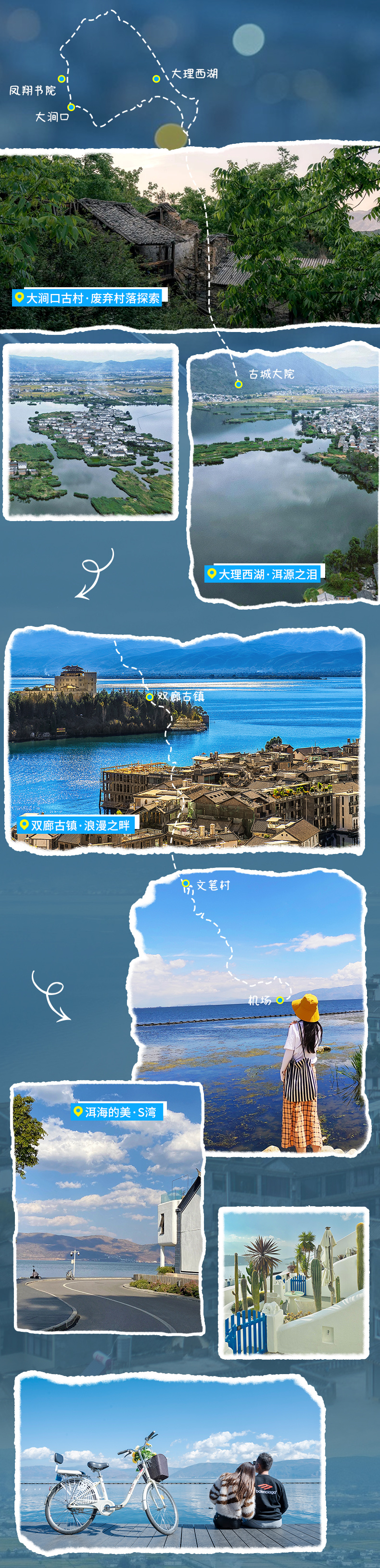 大理S弯-凤羽古镇-凤翔书院-古梨园空中稻田剧场-大涧口古村探索-大理西湖-双廊古镇-洱海日落(约150KM,车程约4小时)