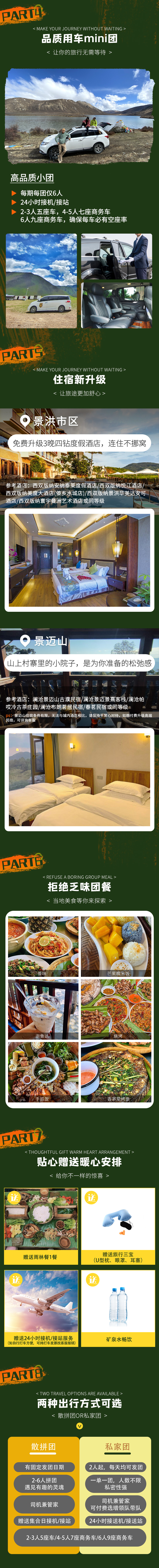 1、住宿:景洪四钻酒店3晚(参考:西双版纳安纳泰莱度假酒店或西双版纳悦江酒店或西双版纳美度大酒店(傣乡水城店)或西双版纳景洪华美达安可酒店或西双版纳寰宇曼洲艺术酒店或同等级),景迈山客栈/民宿2晚(参考:澜沧景迈山古濮民宿或澜沧景迈景熹客栈或澜沧帕哎冷古茶庄园或澜沧布朗茗居民宿或春茗民宿或同等级);