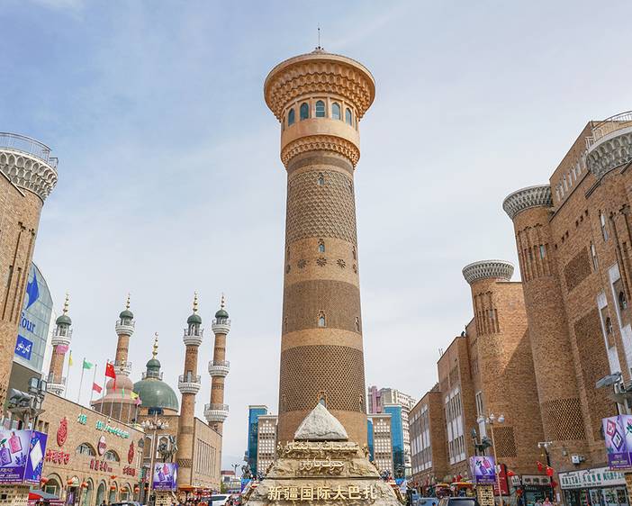 【国际大巴扎】——世界上规模最大的巴扎(巴扎为维吾尔语,意为集市)。具有浓郁的伊斯兰建筑风格,体现了浓郁的西域民族特色和地域文化,这里除了有令人眼花缭乱的商贸市场外,还有美食广场、观光清真寺、80米高的新疆第一观光塔等设施。