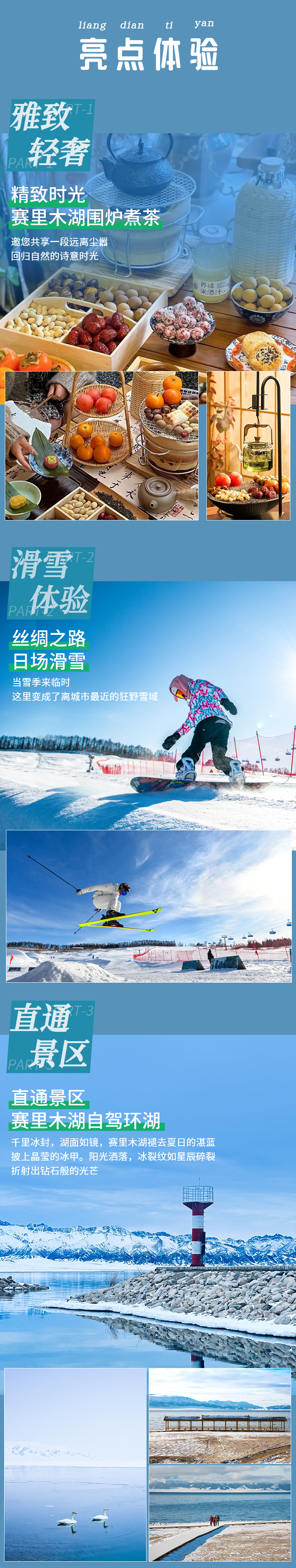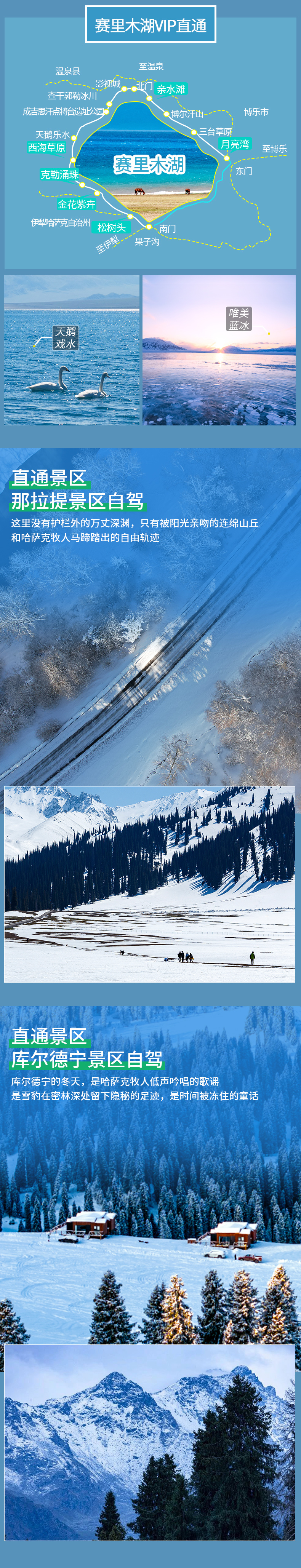 4、门票:丝绸之路国际滑雪场初级雪票+雪板,赛里木湖自驾环湖,那拉提自驾,库尔德宁自驾门票,天鹅泉门票;