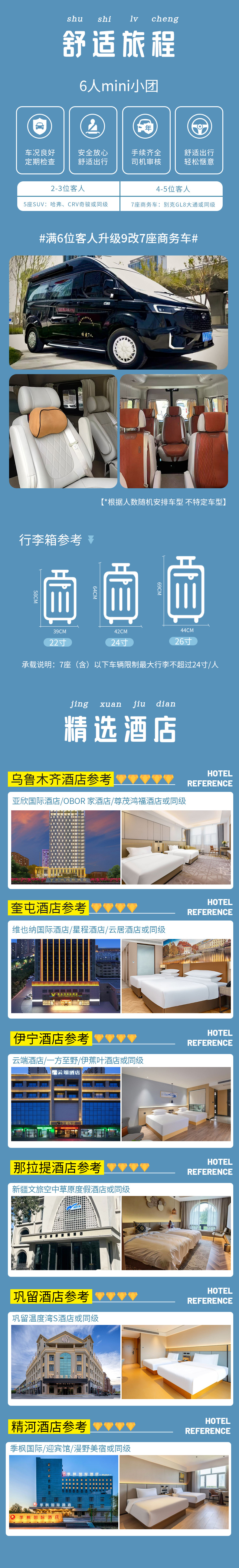 3、用车:2-3人用5座SUV,4-5人用7座商务车,6人用9改7大七座商务车(小团副驾驶及前后座位置需要轮流乘坐,望悉知);