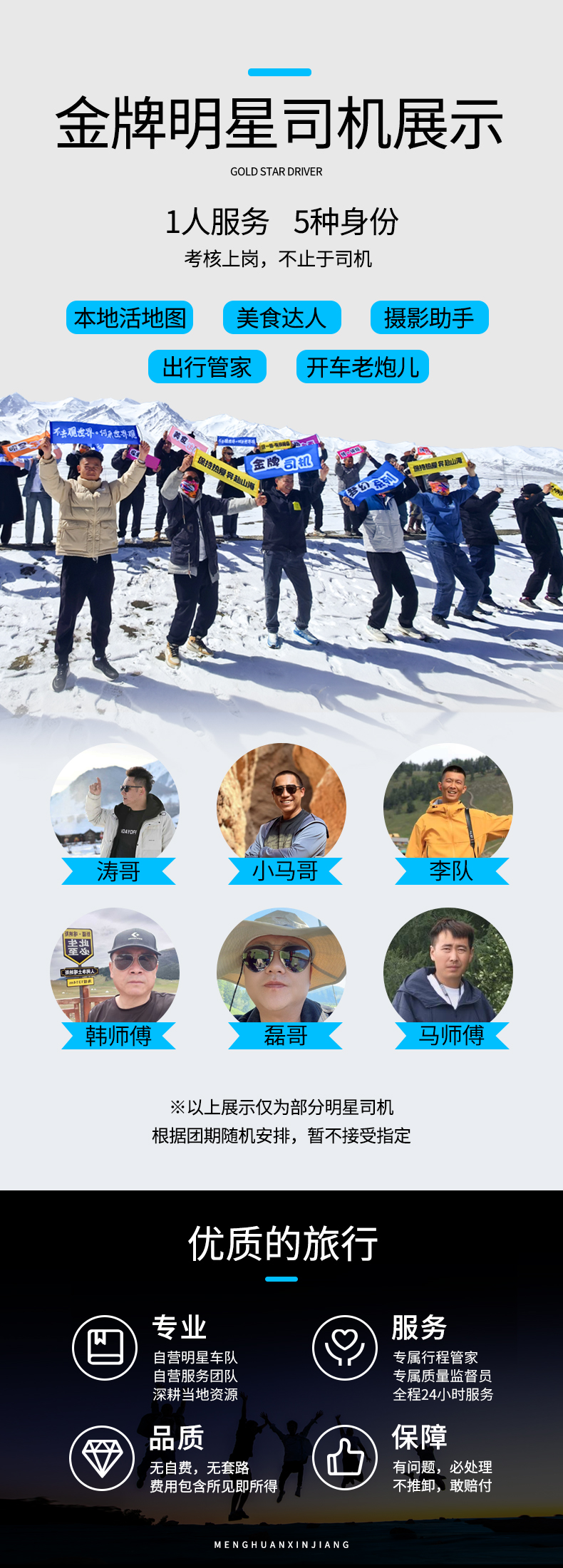 5、领队:司机兼管家,司机帮助大家购买门票,给团友游玩建议,有些景区无法全程陪同进入和提供专业讲解等服务,敬请谅解;