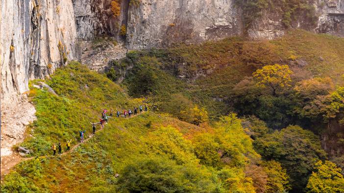 午餐后,穿行在绝壁之上的丛林之中,茂密的树林偶尔打开,瞬间感受到行在云端的感觉。看着悬崖绝壁上的下行小梯,不禁感慨,如此绝壁上竟有这样一条小路,妙哉妙哉!之后抵达【八里沟景区】,入住景区内宾馆。