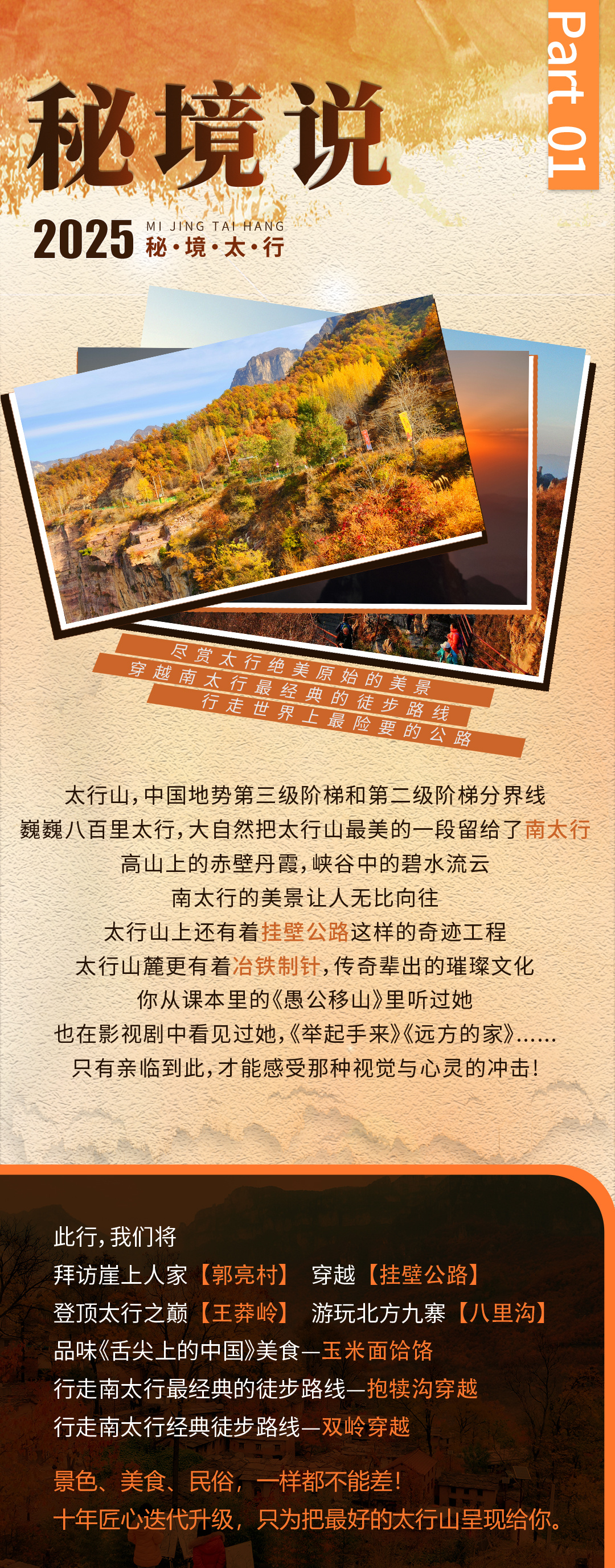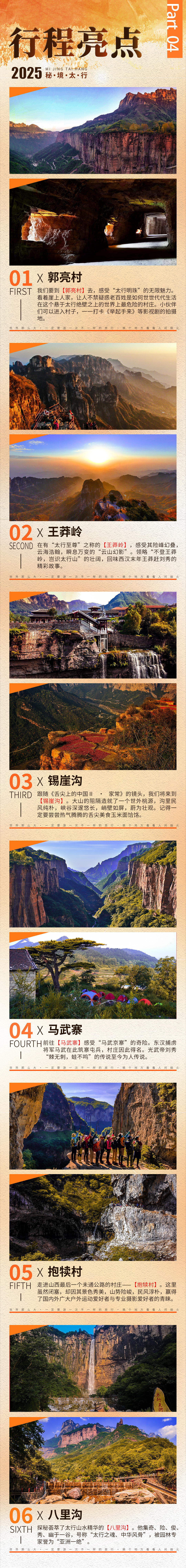 早餐后,出发前往【万仙山景区】。我们将徒步行走这世界第九大奇迹——【郭亮挂壁公路】,亲身感受十三位壮士锲而不舍的精神。站在【崖上人家】观景台上,200余米高的赤红色太行绝壁在你的面前,在你的心里横冲直撞。挂壁公路横挂其上,如梦如幻。来到【炮楼】,远处轿顶山如天宫一般,镶嵌在数百米的绝壁之上,何其壮观。在【天梯】,我们还能看到老一辈郭亮人对外沟通的唯一道路挂在崖壁之上。