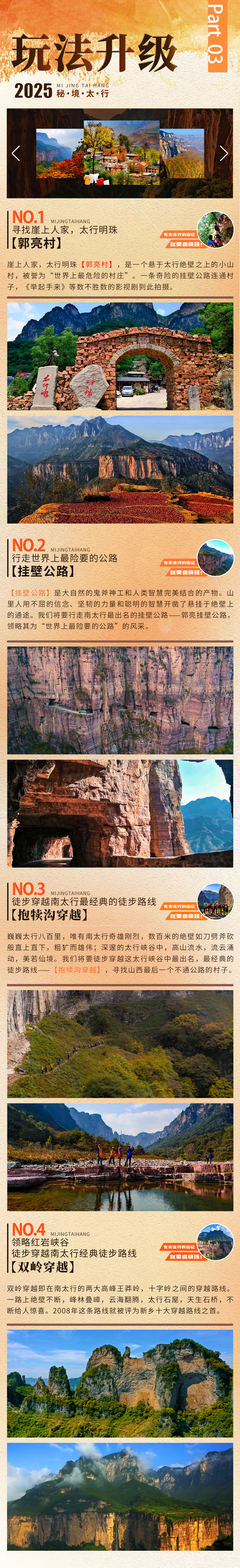 1、不徒步的伙伴,可以休闲游玩天界山,九连山等景区,全方位感受太行的峡谷景观和历史人文,详询客服。
