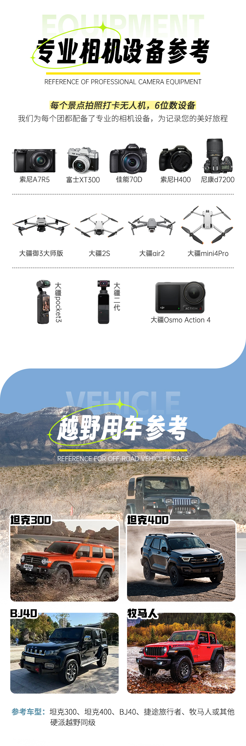 随车配备单反和无人机(行程随车配备索尼/富士/佳能/尼康单反(均配置长焦镜头)和大疆御系无人机)