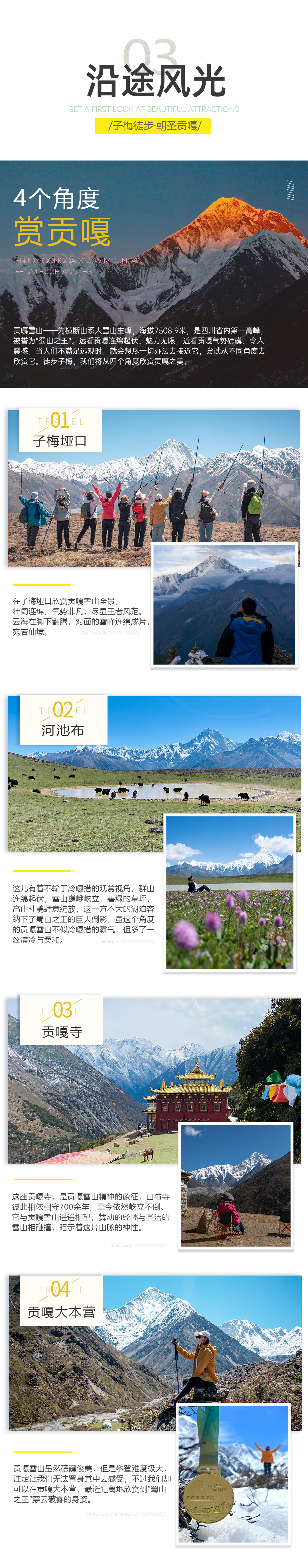 早上8点早餐后乘车大约40分钟到达子梅垭口,观赏到包括那玛峰等卫峰在内的贡嘎雪山全景。这里是拍摄贡嘎雪山全景的最佳位置,一路行行摄摄,移步换景,徒步3公里,一路下坡到达河池布。在这里观赏贡嘎雪山倒影,运气好,还可观赏到莫溪沟云海和佛光。