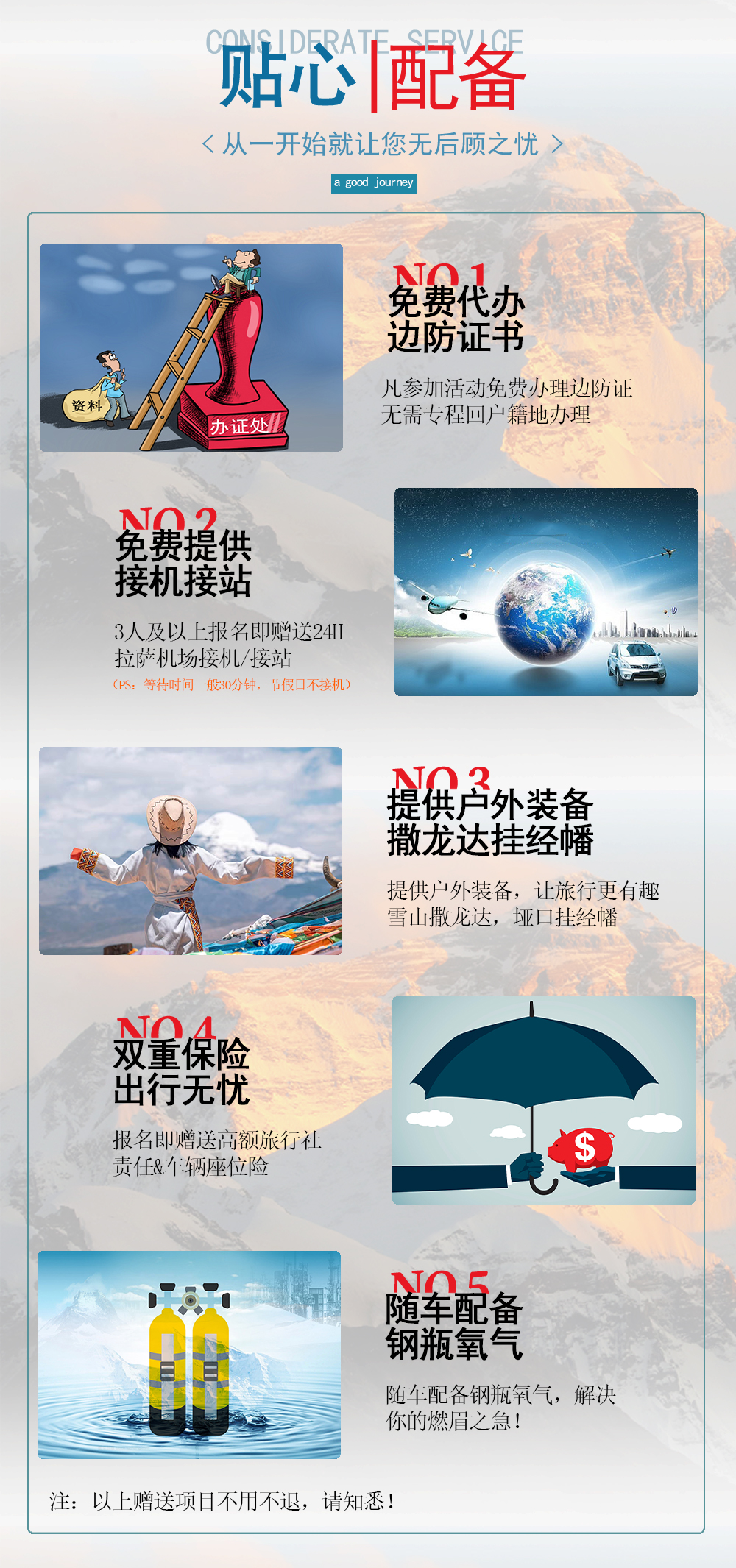 5、旅游责任意外险50万、高原险20万。