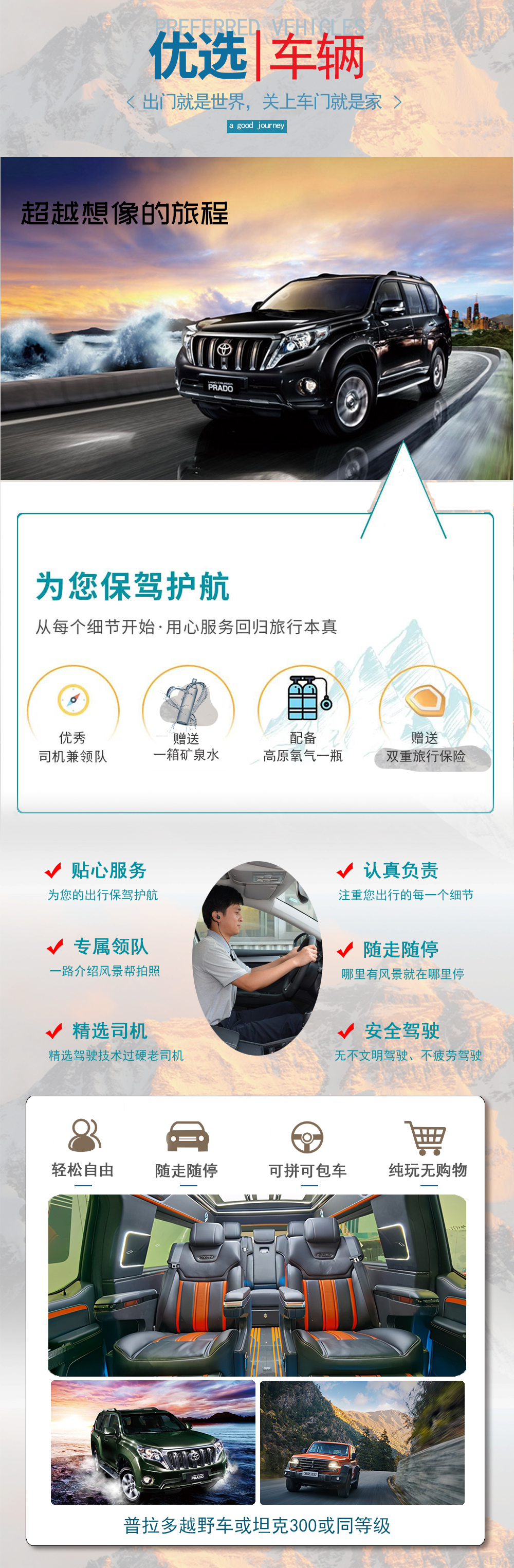 普拉多/坦克越野车出行,随车单反/无人机,钢瓶氧气 全程升级住宿,98%酒店含氧,包含门票+司机吃住