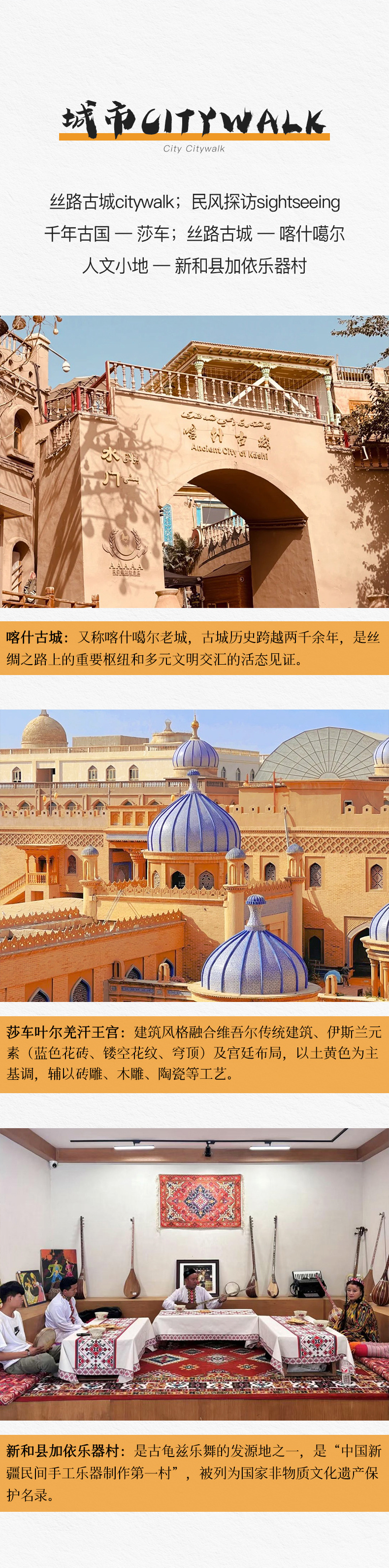 早餐后出发前往喀什,到达古城后领队带大家来一场Citywalk,从东门进入古西域风格的街区,一路观赏土陶、花帽等琳琅满目的传统手工艺品,西城游览彩虹巷(彩色墙面拍照)、爱情巷(浪漫主题涂鸦)、古董巷(淘复古手工艺品),在百年老茶馆点一壶药茶搭配着馕,观赏民间艺人演奏热瓦甫、都塔尔,深度体验维吾尔族居民生活。第二天大家自行散团。