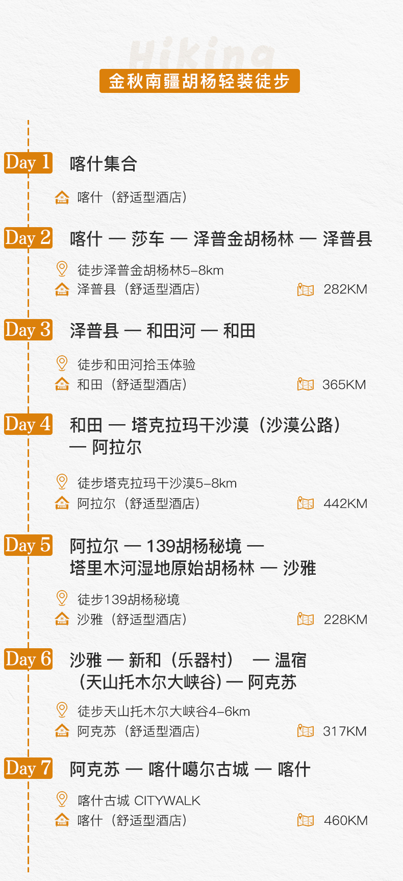 早从喀什出发前往莎车,参观叶尔羌汗王陵,在莎车老城寻访当地特色以及午餐。离开莎车前往泽普金湖杨国家森林公园,这里有着“胡杨、水、绿洲、戈壁”四位一体的独特风貌,我们选择徒步的方式,在金色胡杨和沙枣林间穿梭,和胡杨王合影,探访长寿村的秘密,打卡知青旧址回忆峥嵘岁月……
