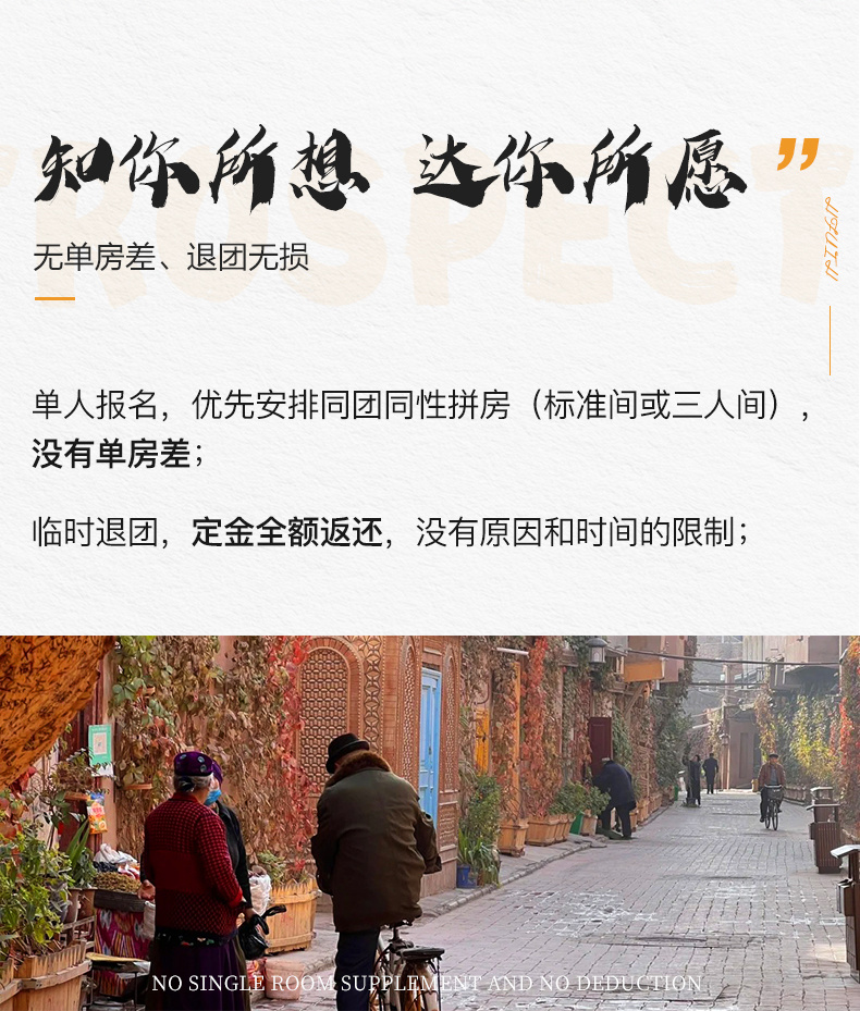 关于单房差的说明:单人报名,我们会安排同性拼房(标准间或者三人间),如不愿与他人合住者,以及携带异性儿童者,请补单房差(独立定制团队需补单房差);