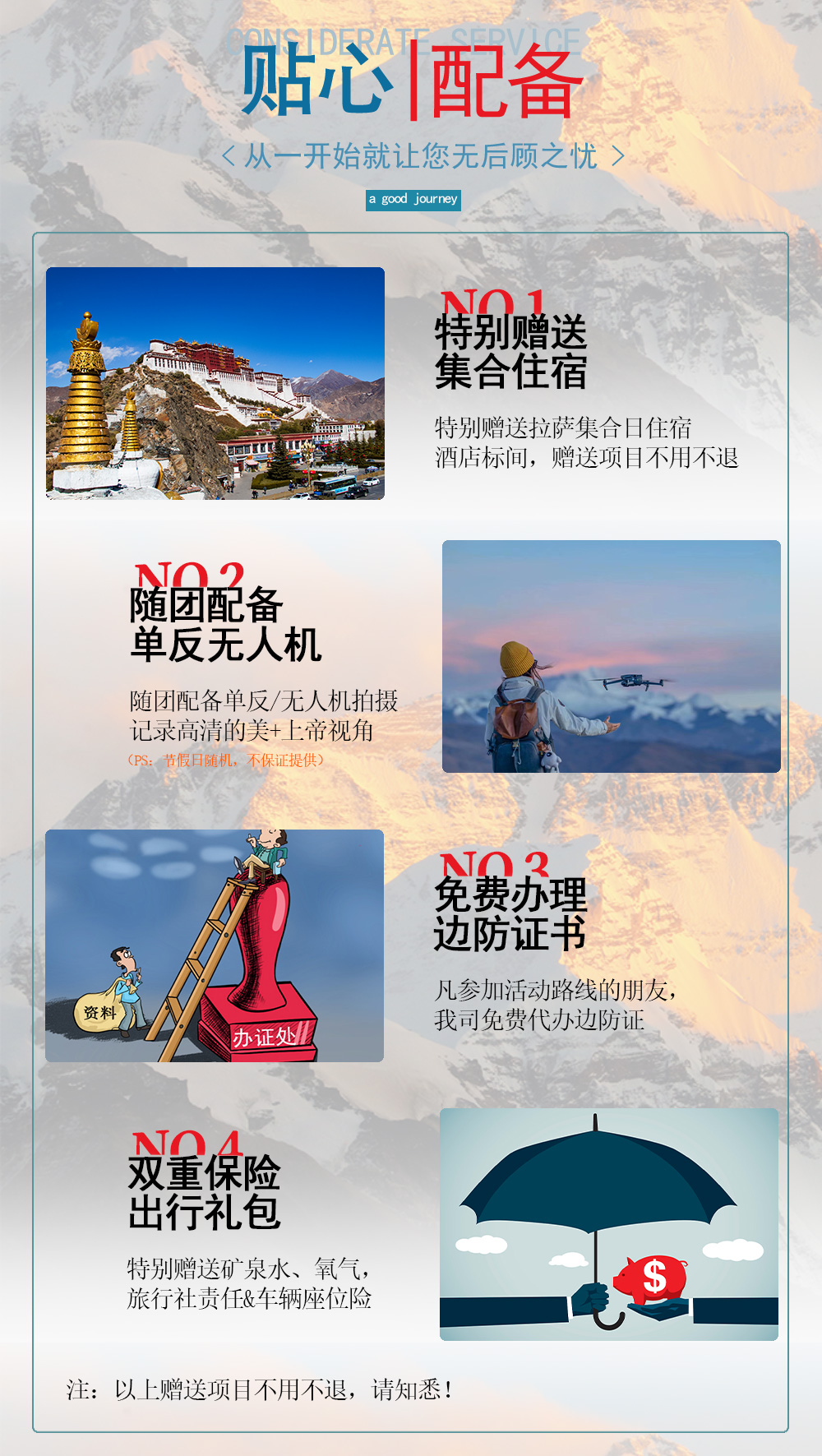 3、门票:行程所列景点首道大门票全含 ,统一办理边防证; 注: 有犯罪记录、 五大藏区藏族同胞和新疆同胞无 法在西藏办理边防证;