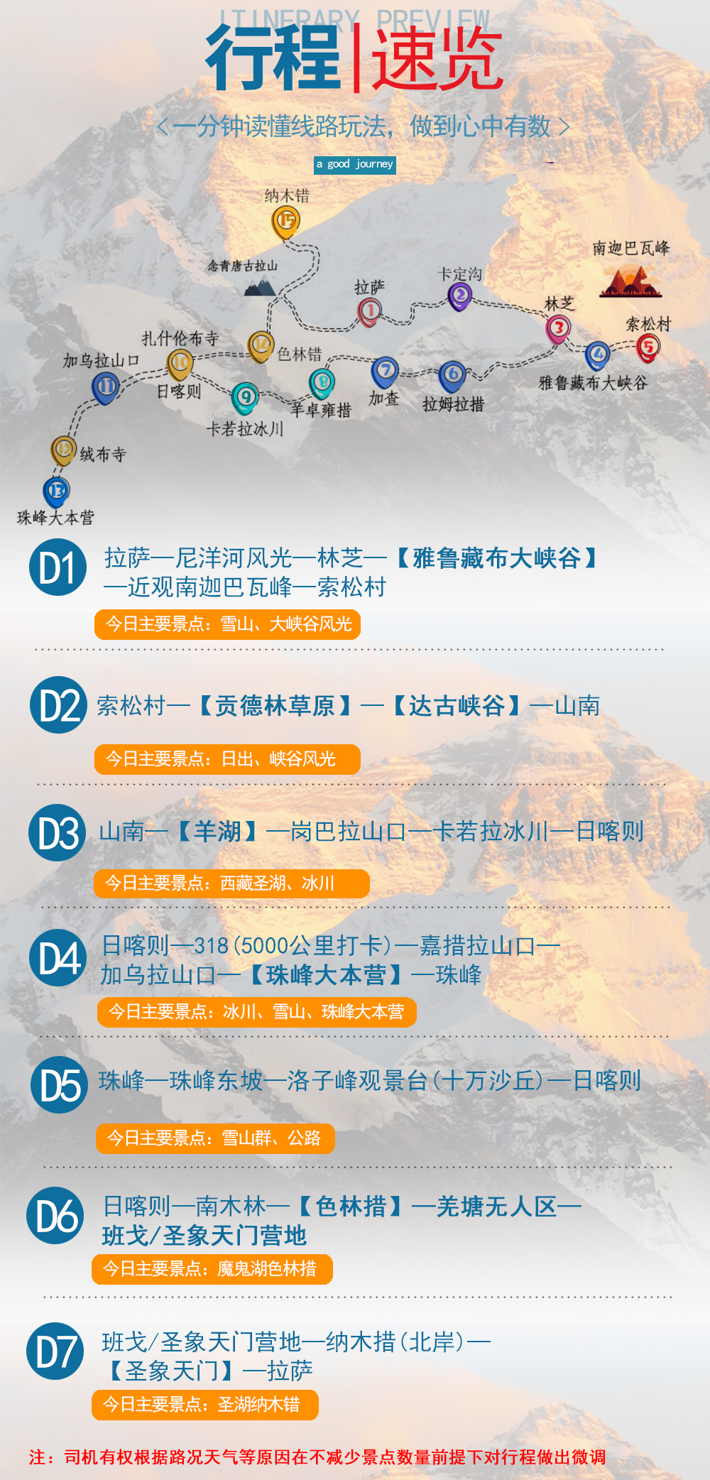 3.自驾旅游系长距离、长时间旅行,途中时间较长,长时间高原行车可能会遇到汽车抛锚并影响行程的情况;请游客做好心理准备。如遇人力不可抗拒因素,如塌方、路阻、车辆事故故障、当地政府行为等造成行程延误,或不能完成上述景点,责任不在俱乐部,俱乐部不承担责任,由此产生的超支费用由游客自理。