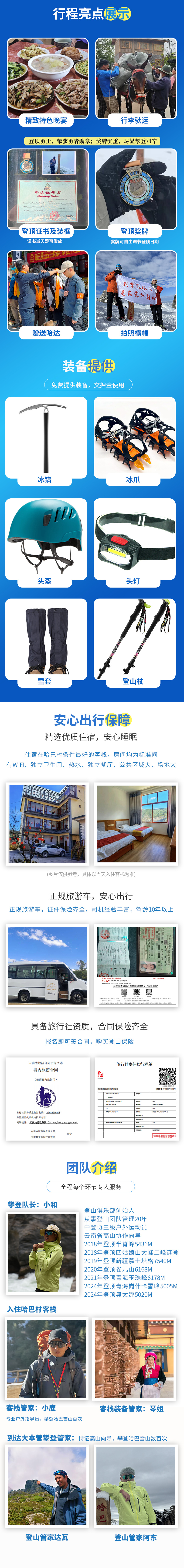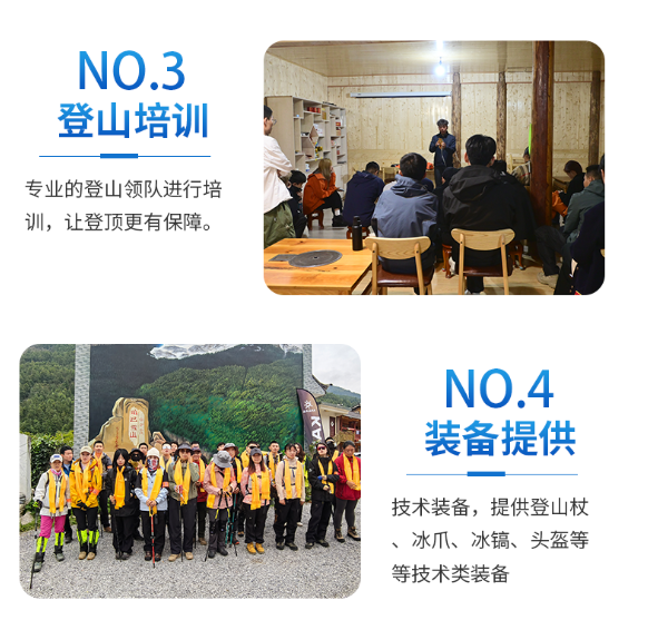 7.登山杖、头灯、头盔、雪套、冰爪、冰镐免费提供使用,可以不准备。