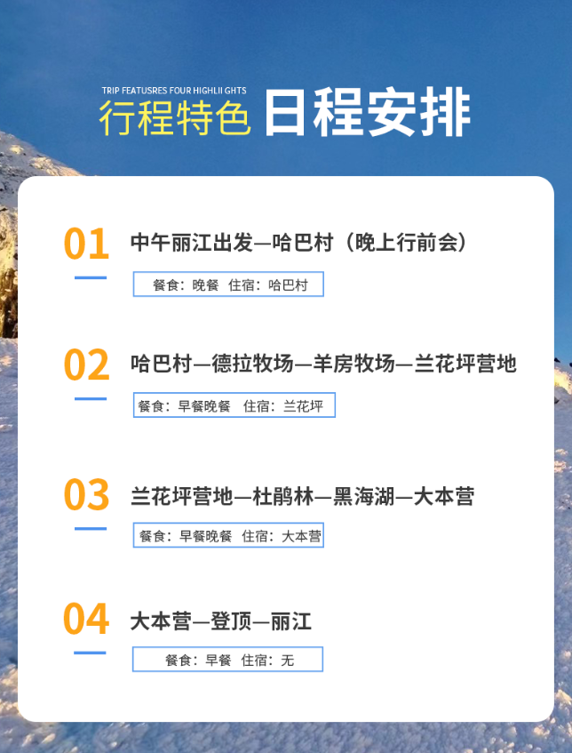 凌晨3点从大本营出发,经过小树林、大石板陂,穿过雪线,登上绝望坡,走过月亮湾,最终成功登顶哈巴雪山,再原路下撤回到大本营后,返回哈巴村。(注:需天气适合、自身身体适合方可成功登顶。)从大本营下撤至哈巴村,可选择自费骑马(提前预约)。当天登顶成功,可当天发放登顶证书。