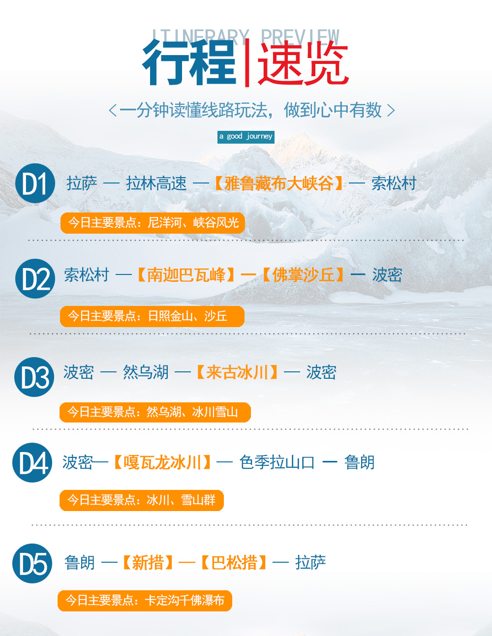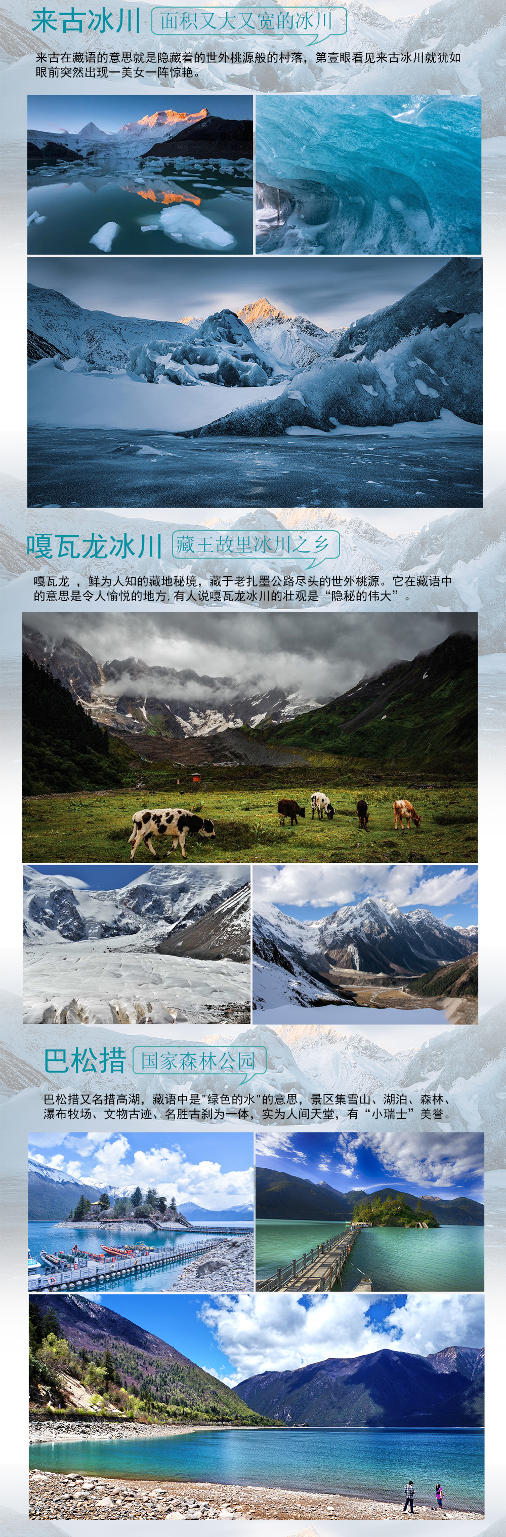 3、【门票】行程所列景点首道大门票:雅鲁藏布大峡谷、巴松措、来古冰川;备注:我社只含以上所列景点的门票及观光车费用,未在内的需自费,此价格已享受门票减免政策,景点不去不退费用,请悉知!