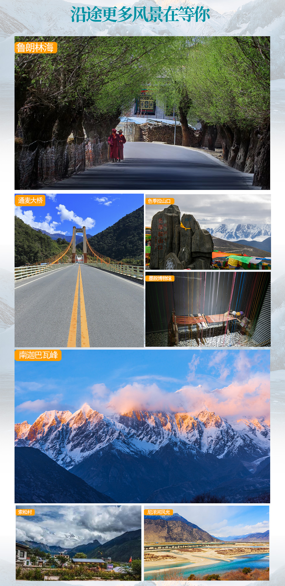 大约行驶 4.5 小时后,我们抵达有着 “西藏江南” 之称的林芝。稍作休整,品尝当地特色的石锅鸡后,继续向色季拉山进发。色季拉山是川藏线上的著名景点,海拔约 4728 米,这里是观赏南迦巴瓦峰的绝佳地点之一。如果运气好,能看到南迦巴瓦峰的主峰从云层中露出真容,其雄伟壮丽的景象定会让你为之震撼。山间植被丰富,随着海拔的变化,从阔叶林到针叶林再到高山草甸,景色层层递进,美不胜收。
