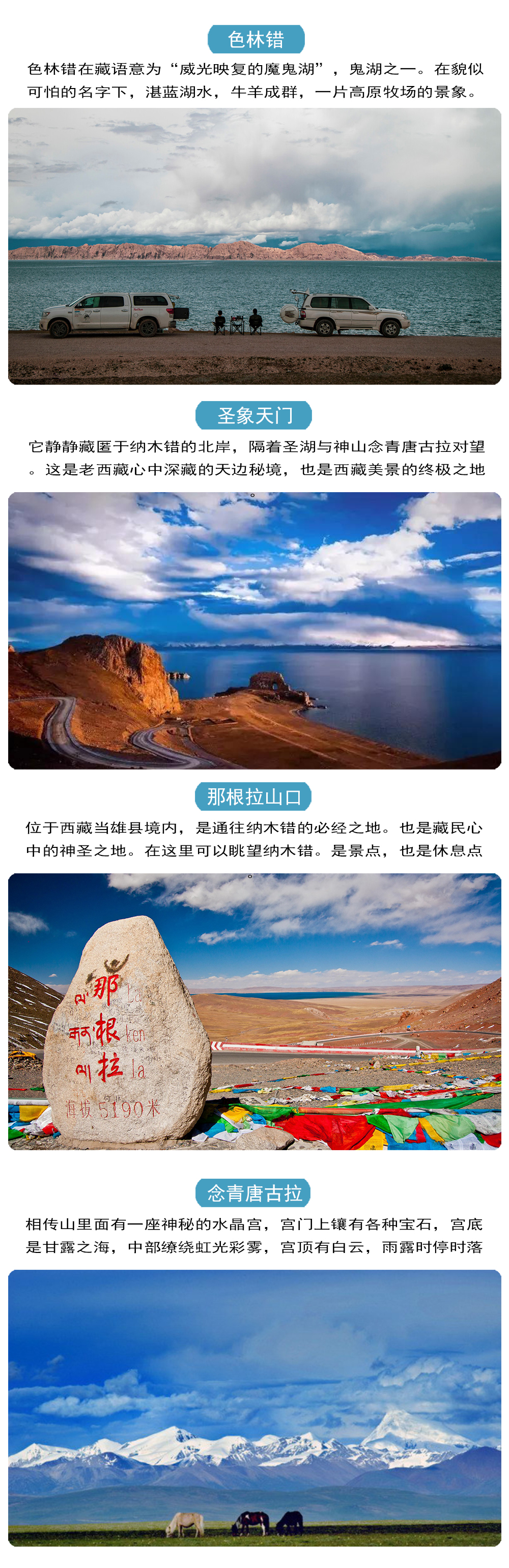 起床早餐后继续出发,我们今天早上再坚持早起一天,前往圣象天门游玩,它静静藏匿于纳木错的北岸,隔着圣湖与神山念青唐古拉对望。这是老西藏心中深藏的天边秘境,也是西藏美景的终极之地。翻过山口就是当雄县,继续往前到达念青唐古拉山口的观景台,看到终年不化的山顶积雪,纵横交错的远古冰川,巍峨雄伟的穷母岗日峰,下车与这座将西藏分成藏北、藏南、藏东南三大区域的雪山合影留念之后我们继续往前,下午回到拉萨。回到拉萨恍如隔世,晚上腐败聚餐,把酒当歌,纵情狂欢,为这段难忘的旅程画上圆满的句号。相信,今天的拉萨的夜晚,属于我们,一醉方休。
