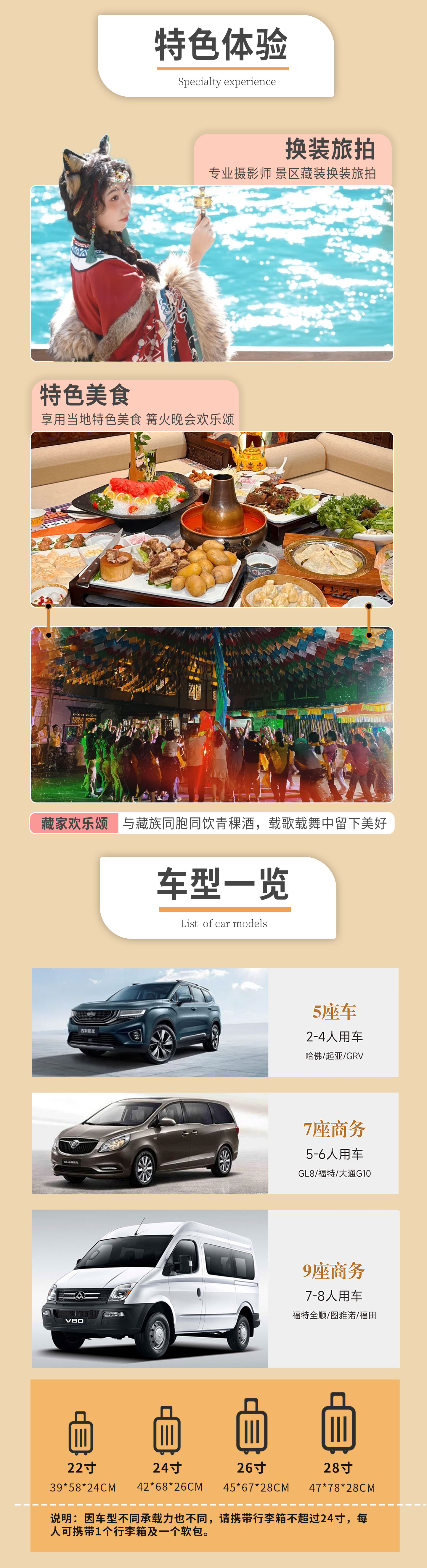 (3)行李箱:小车空间有限,行李箱大小请控制在20-24寸。