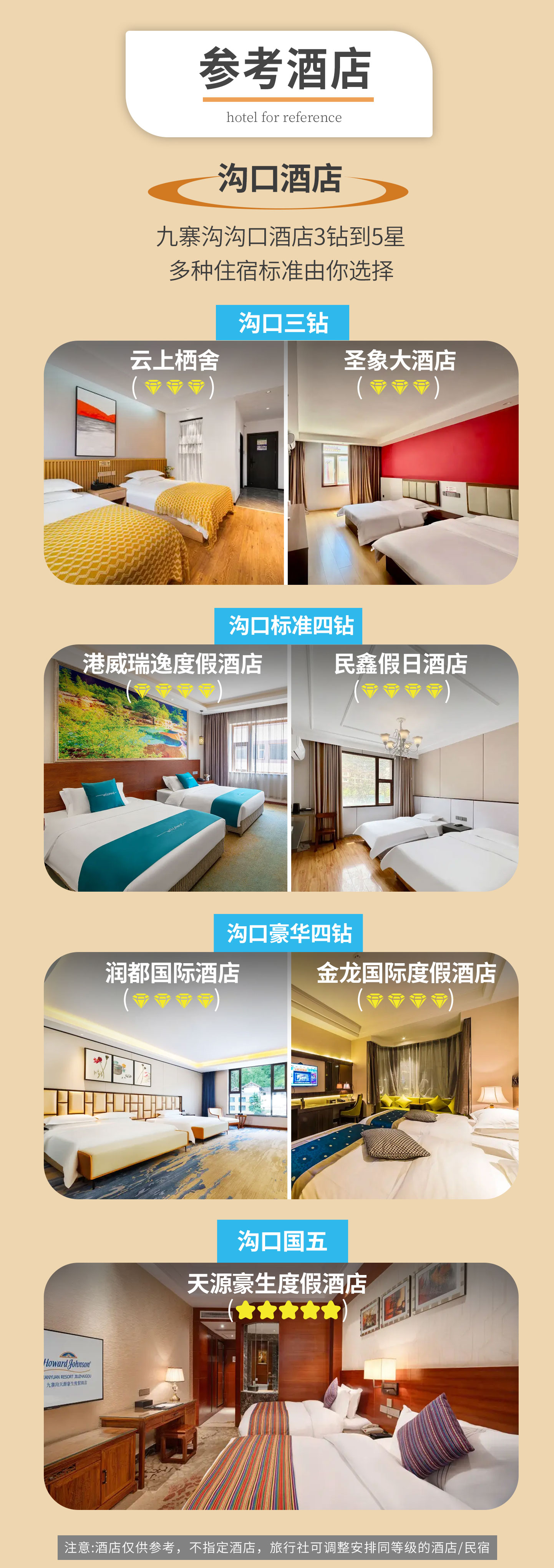 九寨沟轻奢4钻:港威瑞逸、民鑫假日、泊悦美筑、梵山丽景、金卓林、鑫源、晶都、纳斯璞缇、品悦、九寨沟鑫凯逸酒店、九寨沟云上栖舍、麓居酒店(九寨沟风景区千古情店)、九寨沟正顺享达酒店(九寨千古情店)、九寨沟景悦酒店、九寨沟港威瑞逸度假酒店(九寨千古情店)、九寨沟天澜酒店、九寨沟芷熙酒店(九寨沟风景店)、阔博·琼熙私汤民宿(九寨沟景区游客中心店)、九寨沟景悦度假酒店、智选假日酒店(九寨沟风景区店)、名人酒店、九寨沟千鹤丽呈酒店(九寨沟游客中心店)、九寨沟万怡酒店、九寨沟宜途品悦别院等同级