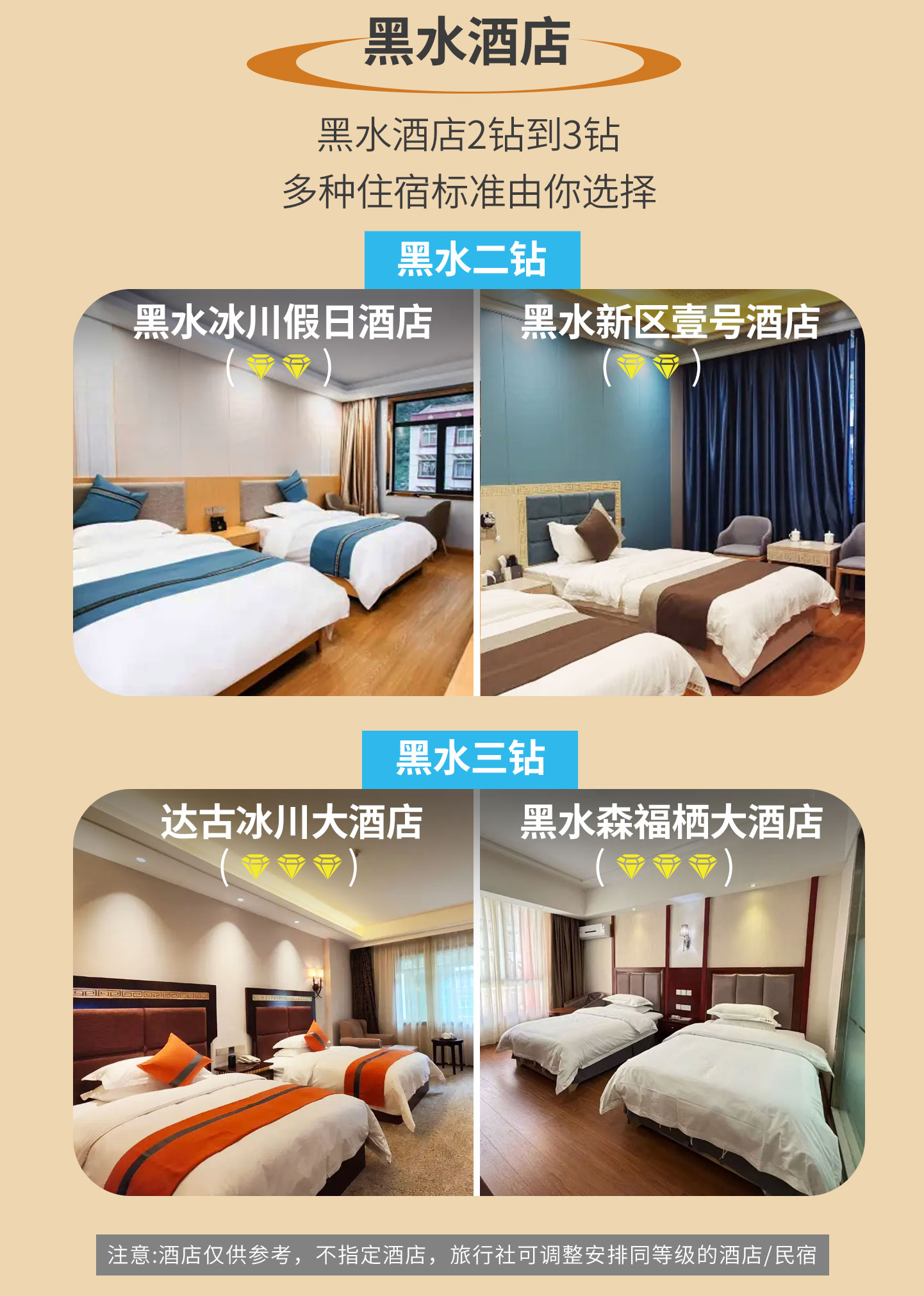 黑水轻奢3钻:央宗林卡酒店、羊茸哈德、黑水彩林庄园、大古冰川大酒店、铂景酒店、黑水芦花大酒店、黑水冰川逸景酒店等同级