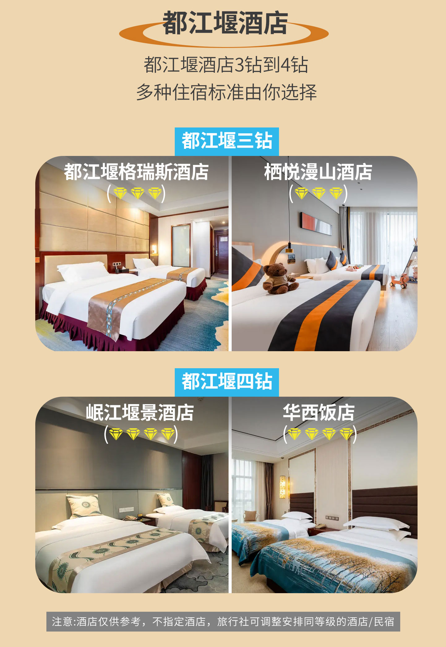都江堰/汶川轻奢3钻:汶川禹皇酒店、锦绣云吉大酒店、新汶川大酒店、格瑞斯,盛逸,岷玉,耕豪,栖悦漫山、维也纳国际酒店(都江堰店)、都江堰黄龙酒店、悦宸酒店(都江堰迎宾路站离堆公园站店)、蔚徕酒店(都江堰医疗中心离堆公园站店)、汉庭酒店(都江堰店)等同级