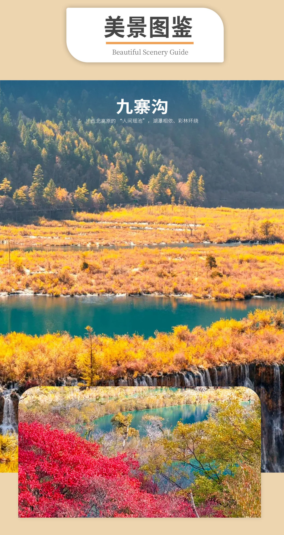 九寨沟风景区:(九寨沟为自然风景游览胜地 ,以拍照参观为主) --树正沟、 日则沟、则查洼沟 ,这三条沟略似”丫”字形。景区内有九寨沟最宽、最高、最雄伟壮观的三大瀑布;珍珠滩瀑布、诺日朗瀑布,双龙海瀑布,景区内共有一百多个高山湖泊及数十处高低不一的流泉飞瀑等景观。最美最奇特的是九寨沟的水 ,清冽透底 ,变幻无穷。九寨沟是岷山山脉一条纵深达 40 多公里的沟谷 , 因沟内有九个藏族村寨而得名 , 由奇异多彩的藏族风情组成格调自然风韵独具的仙境 ,景区以翠海(高山湖泊)、叠瀑、彩林、雪山、藏情“五绝”驰名中外,被誉为“童话世界、人间仙境”。