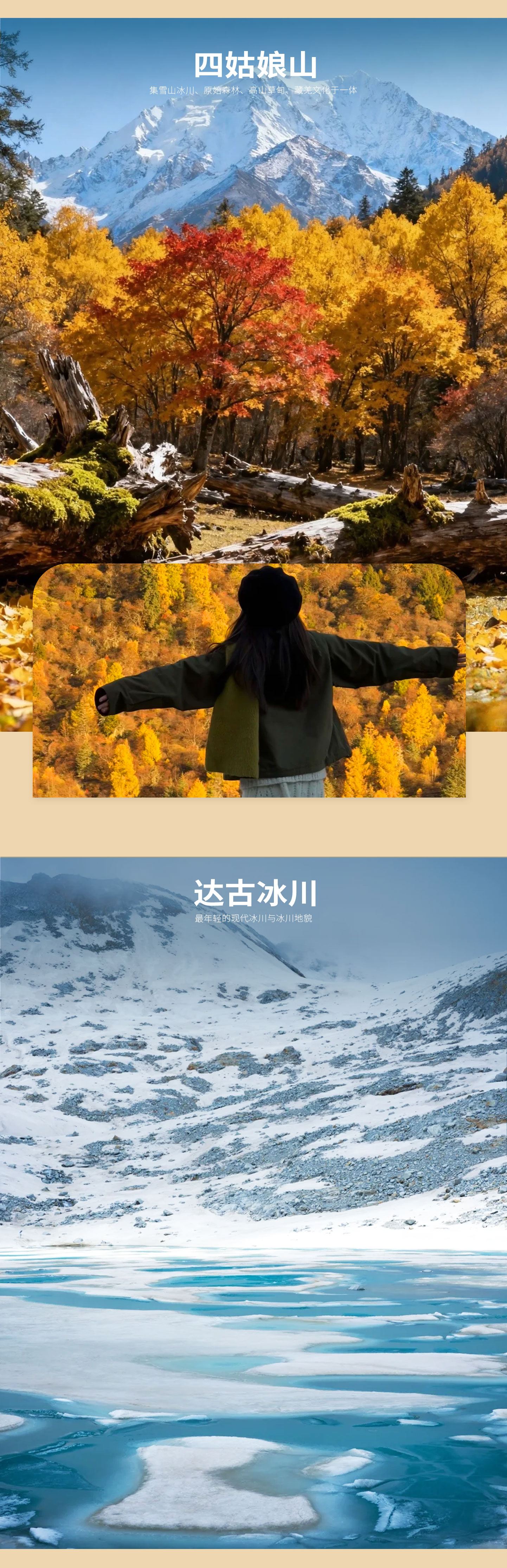 达古冰川:换乘景区观光车沿途可游览【金猴湖】后进入藏民风情体验区 ,游览【上、中、下达古藏寨】【放生湖】,进入高山牧场休闲区可游览【达古湖】,到达索道下站客人可选择自费乘坐景区便民设施,全球第一高海拔观光索道 ,到达海拔 4860 米的冰川腹地 ,融入空旷寂灵的冰天雪地 ,观赏一号冰川 ,感受一览众山小 ,俯视一切的雄壮气概 ,或者徒步游览【凌云瀑布】【红石坡】等景点。