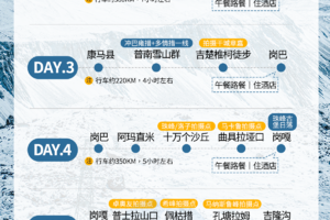 早上出发前往阿玛直米雪山(可早起看日出),游玩后经过定结湿地到达定结县午餐,之后前往十万个沙丘,这里是拍摄珠峰(8848m,No1)和洛子峰(8516m,No4)的位置,下午翻越曲具拉垭口,这里则可以拍摄马卡鲁峰(8463m,No5),拍摄完走一条极为小众的路线前往岗嘎镇,如果时间充裕则可以前往珠峰古堡机位,拍摄世界第一高峰和古堡的日落。