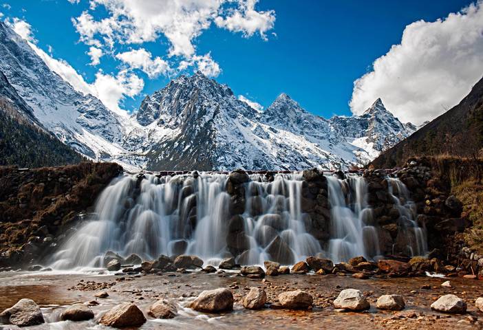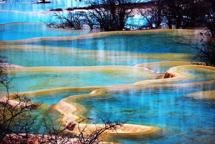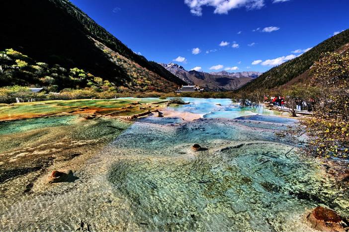 黄龙风景区:位于四川省阿坝藏族羌族自治州松潘县。面积700平方公里。是中国唯一保护完好的高原钙化彩池景观,与九寨沟相距100千米,海拔1700-5588米。黄龙以彩池、雪山、峡谷、森林“四绝”著称于世,再加上滩流、古寺、民俗称为“七绝”。黄龙风景区由黄龙沟、丹云峡、牟尼沟、雪宝鼎、雪山梁、红星岩,西沟等景区组成。行程主要游览景观集中于长约3.6公里的黄龙沟,沟内遍布碳酸钙华沉积。并呈梯田状排列,以丰富的动植物资源享誉人间,享有“世界奇观”、“人间瑶池”等美誉。1992年列入《世界自然遗产名录》。除了高山景观,还可以在这里发现各种不同的森林生态系统,以及石灰岩构造、瀑布和温泉。