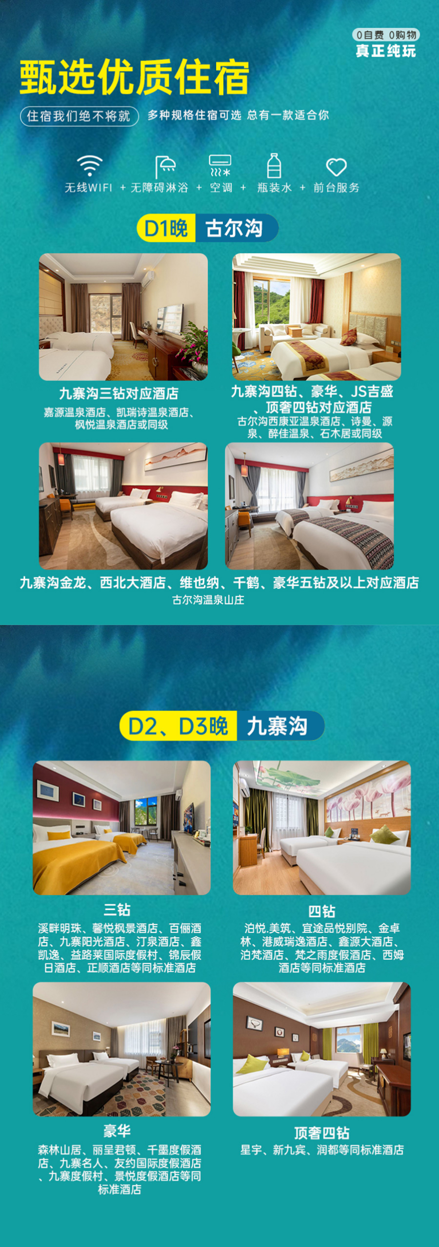 豪华:森林山居、丽呈君顿、千墨度假酒店、九寨名人、友约国际度假酒店、九寨度假村、景悦度假酒店、名雅大酒店、九源宾馆、林景山屿、丽泉大酒店、芷熙酒店、亚朵轻居、西姆山居、九安宾馆、九寨之旅等同标准酒店