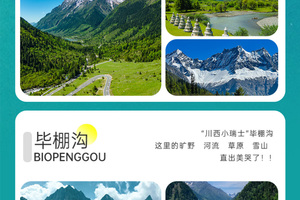 毕棚沟风景区:以其优美的自然风光、完美的自然生态景观、优良的生态环境著称。景区内红叶、杜鹃花种类繁多,森林原始、瀑布飞挂、冰川奇特。毕棚沟被比作四姑娘山的美丽背影。这是个五彩斑斓的世界,浓绿的树,深红的叶,青青的湖,湛蓝的天,纯白的雪;这是个多姿多彩世界,险峻奇峰,一道冰川,人间仙境。毕棚沟全长45公里,面积180平方公里,峡谷幽深,平缓悠远,景区内生态原始,秋季彩林,五光十色。主要景点有龙王海、红石滩、女皇峰、神女十二峰、美人链大瀑布等。