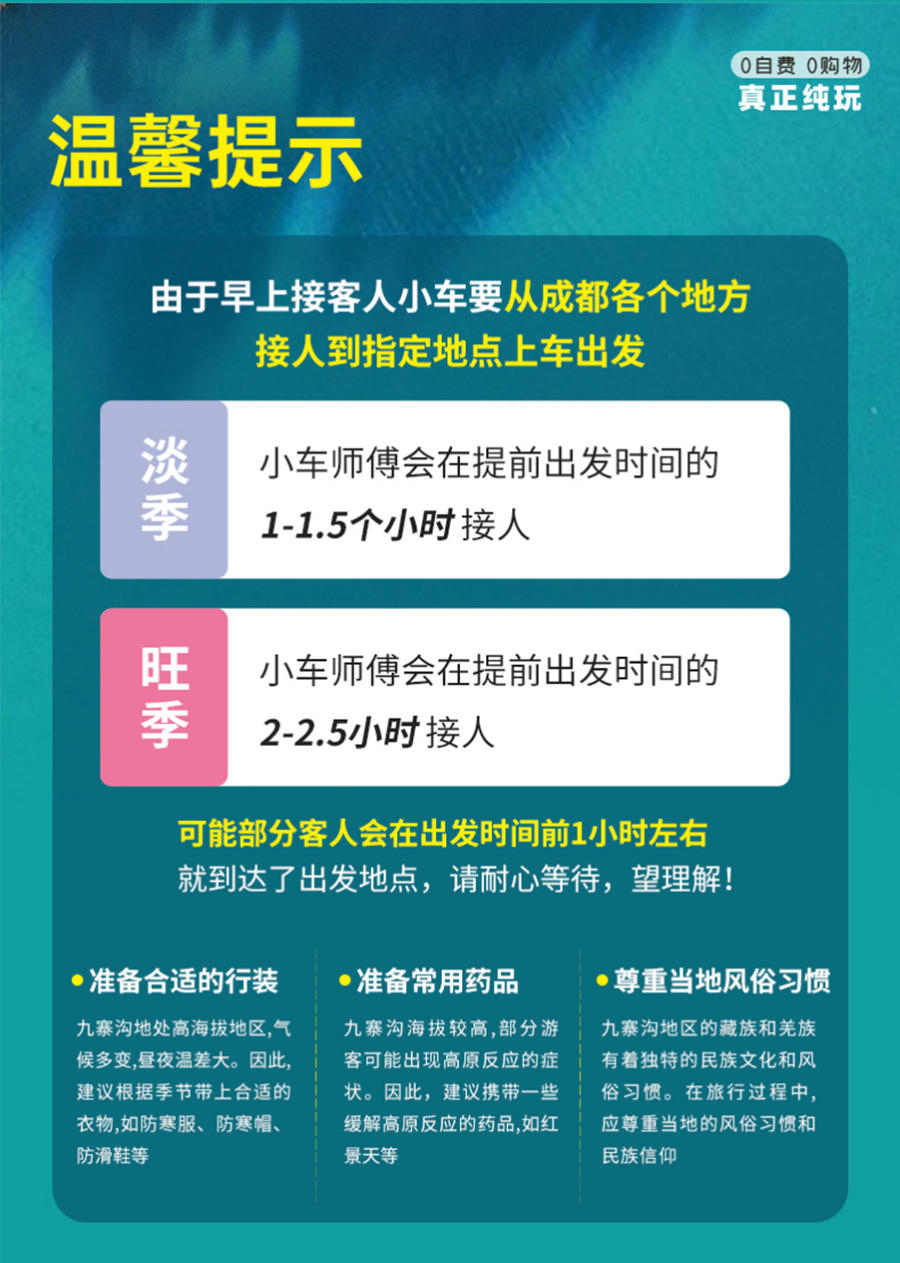 注:此行程免费赠送成都市三环内包接服务,接人师傅会在出团前一天晚6点—9点与您联系,请保持通讯畅通,注意接听电话。