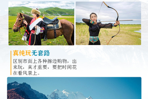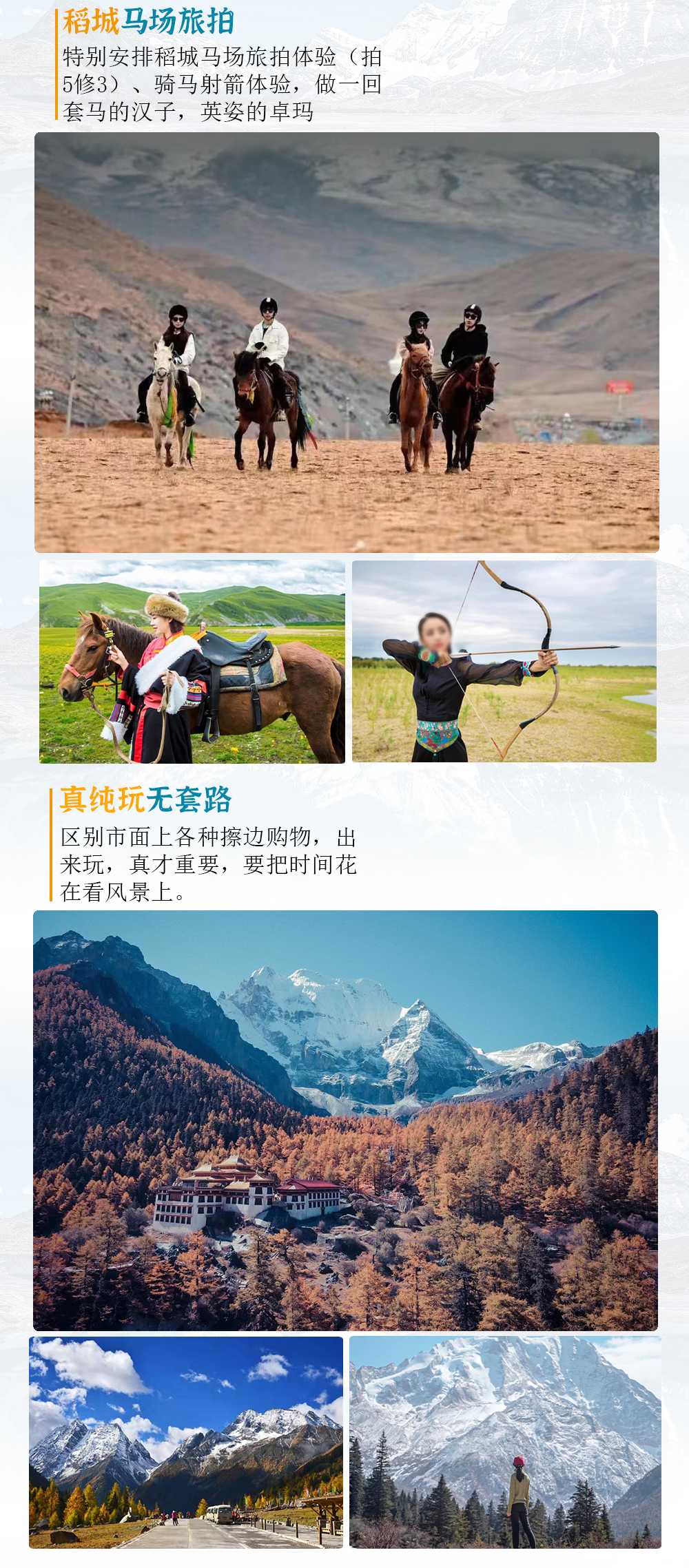 早餐后离开新都桥镇,穿越高尔寺山隧道(全长5682米),经雅江县穿越剪子弯山隧道(全长2230米)、卡子拉山(海拔4718米)、经世界高城,高原明珠—理塘县(海拔4000米)游览丁真的家乡——通勒古镇,经扎嘎神山,沿途可车览毛垭大草原风光,翻越传说中龟兔赛跑—兔儿山(山势奇特,象兔子耳朵一样,长在草木不生存的山峰上,远远望去,就象兔子受了惊吓,恐惧地注视着你,真是妙不可言),途经青藏高原最大的古冰体遗迹—海子山自然保护区(被称为“稻城古冰帽”,海子山面积3237平方公里,平均海拔4500米,共散落着大小湖泊1145个),精妙绝伦的天然岩画—鹿子图腾,经桑堆红草地(红草地为季节性景点,每年九、十月份是拍摄红草地的最佳时节)、稻城尊胜白塔后抵达稻城,在稻城马场骑马射箭旅拍,体验一把套马杆的汉子/姑娘,(稻城,古名稻坝,意为山谷沟口开阔之地)入住:稻城或香格里拉镇(日瓦)。