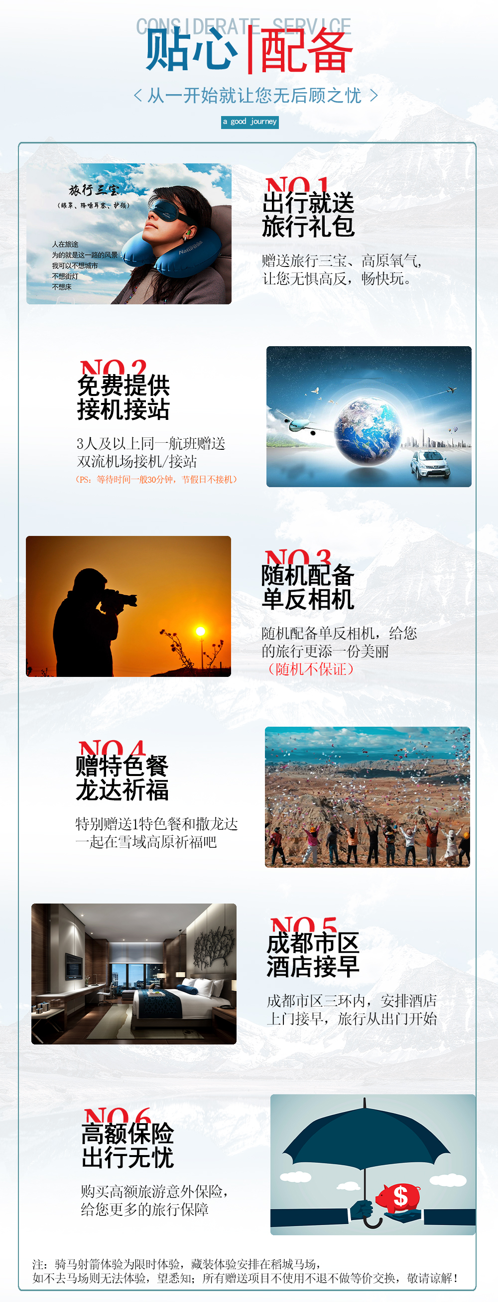 5.由于沿途系民族地区不能与其他城市景区相比,部分地区旅游设施落后,各县(镇)之间相隔较远,所以用餐和到达目的地的时间经常改变请队员做好心理准备,住宿环境也不能与城市的住宿环境比。有洁癖的人可自带睡袋或被单。高原干燥多喝水增加水份补充能量,多吃水果蔬菜。