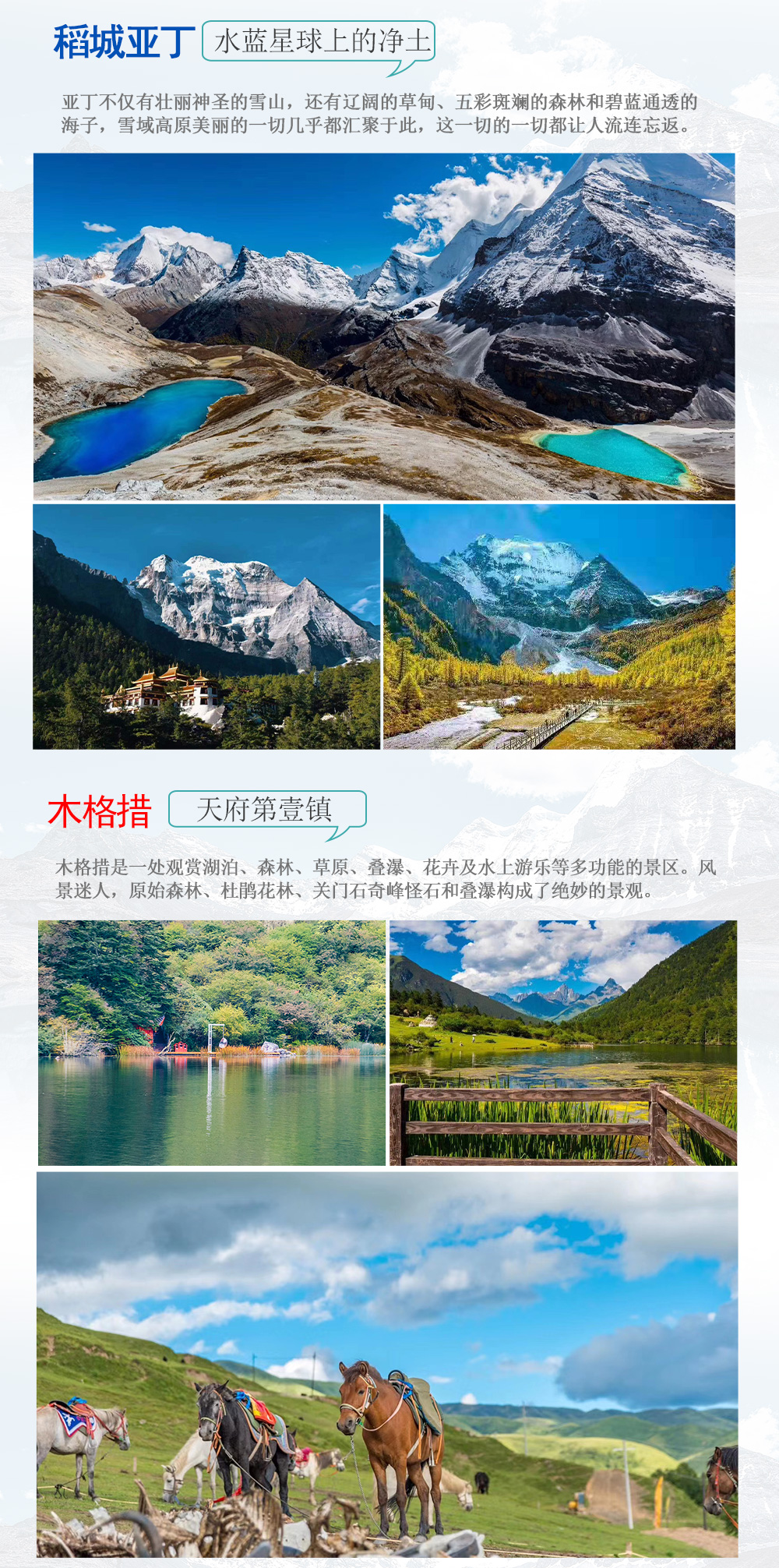 早餐后前往令人神往的亚丁景区。换乘亚丁景区观光车(门票150元/人,观光车费用:120元/人,须由客人自理),翻越牛郎神山(海拔4760米),远眺仙乃日神山(海拔6032米,慈目注视脚下人间仙境,抵达亚丁村,经扎灌崩,抵达冲古寺(藏语意为填湖造寺,海拔3900米),客人徒步或自费乘景区电瓶车(单程50元,往返80元)前往洛绒牛场,建议乘坐电瓶车前往诺绒牛场,徒步到诺绒牛场单程需要2小时,上山时可远观夏诺多吉神山,因牛奶海和五色海海拔高,客人务必根据自身实际情况选择自费骑马前往游览。(牛奶海,海拔4800米,又叫洛绒措,传说能治聋哑病的圣湖。)、五色海,五色海它位于仙乃日与央迈勇之间,海拔4600米,湖面呈圆形。面积0.7公顷,现代冰谷下伸至湖畔,雪山倒影湖面,呈现奇幻的色彩。是藏区著名的圣湖(佛经中赞誉该湖与西藏羊巴雍措齐名),据传能“返演历史,预测未来”。游玩过后出景区入住也可以选择亚丁村入住。