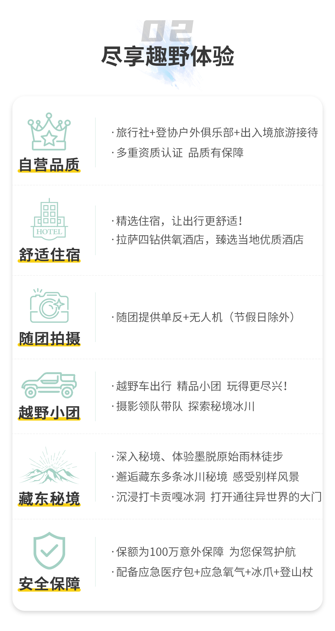 2、深入秘境、体验墨脱原始雨林徒步,打卡雅隆、祥格拉、萨普等多条冰川。